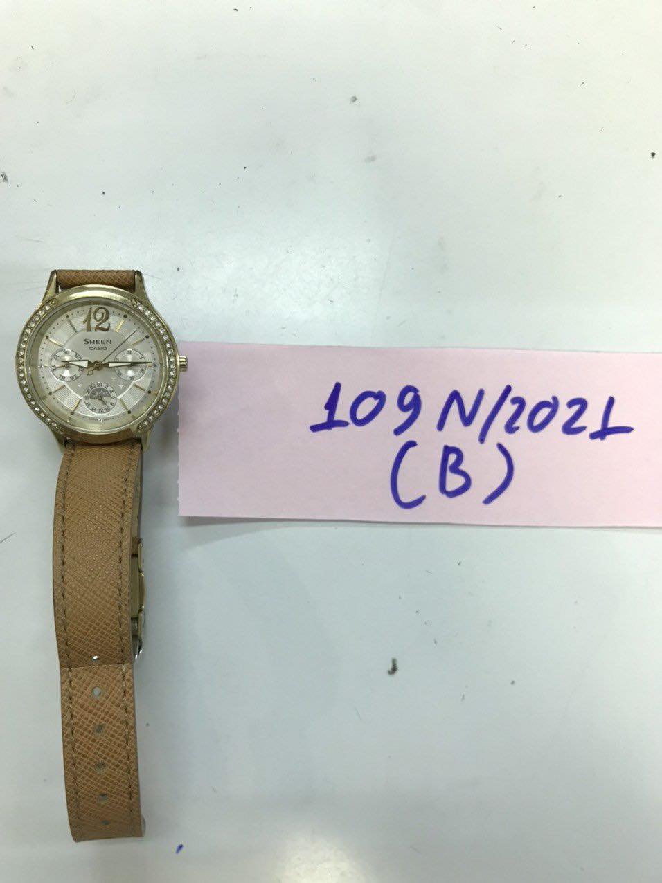 Đồng hồ dây da màu nâu, mặt kim loại màu vàng "Sheen Casio".