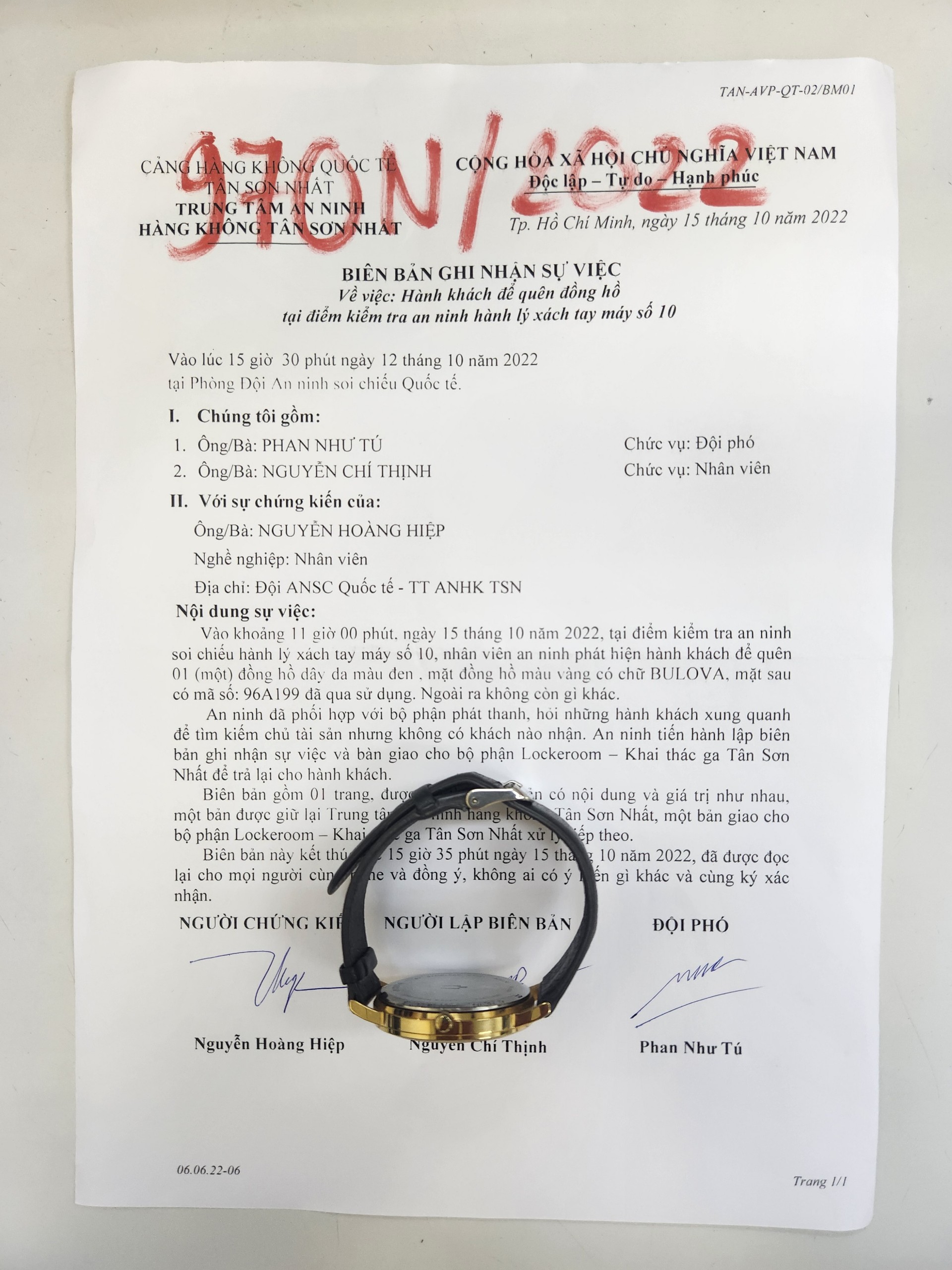 Ngày tiếp nhận: 17/10/2022 Mô tả: 01 đồng hồ dây da màu đen, mặt vàng BULOVA. Vị trí: An ninh soi chiếu quốc tế |