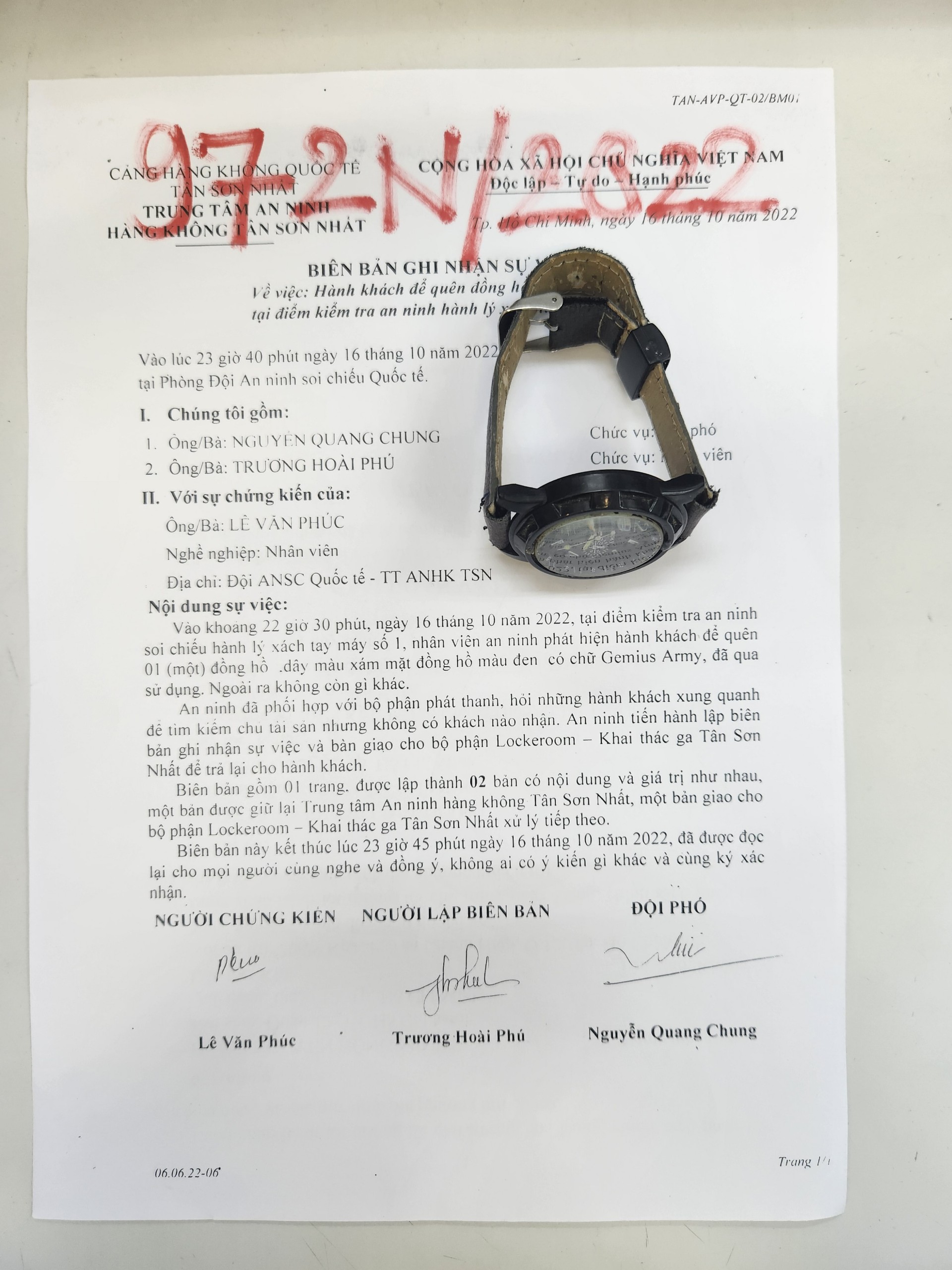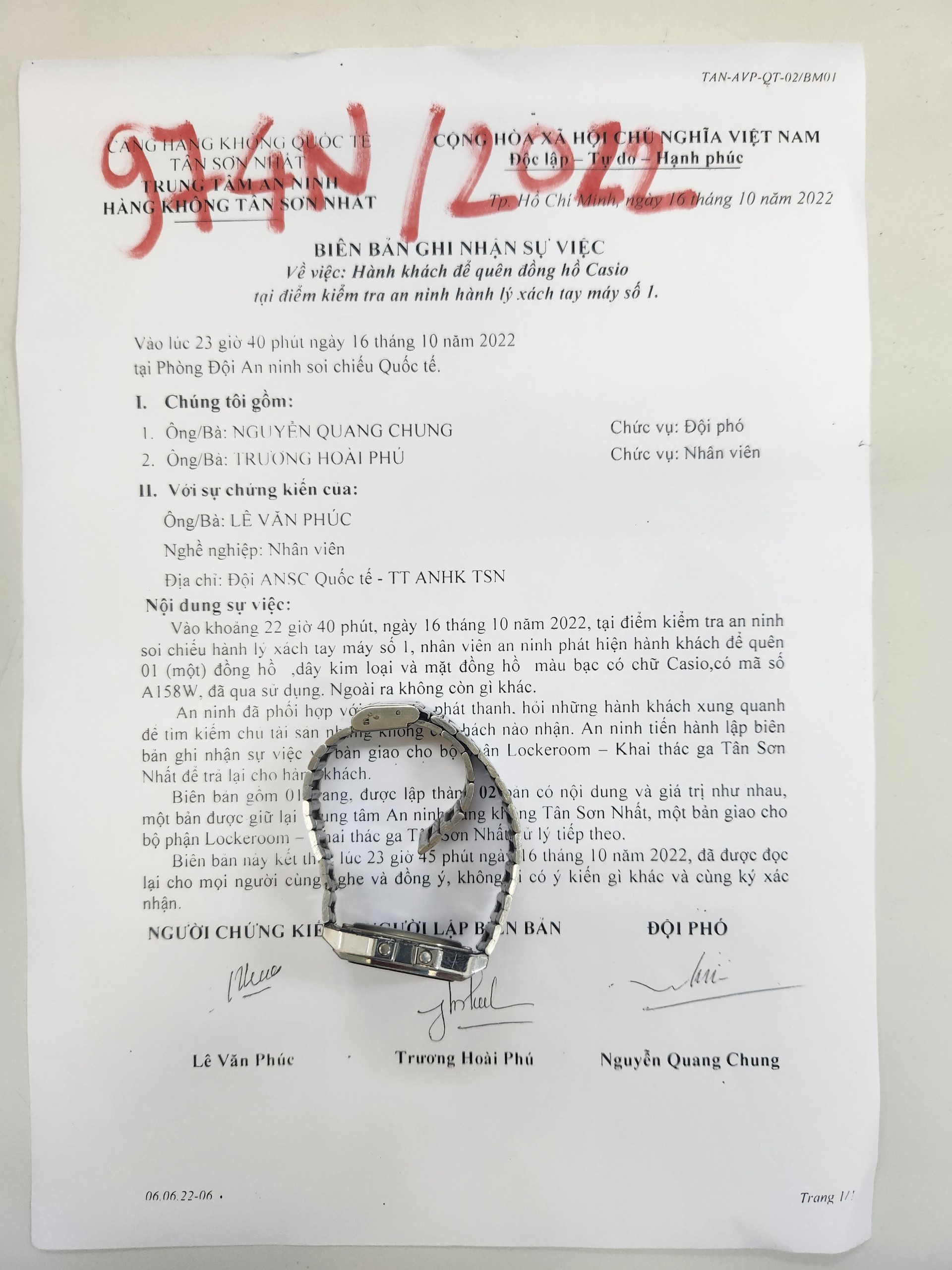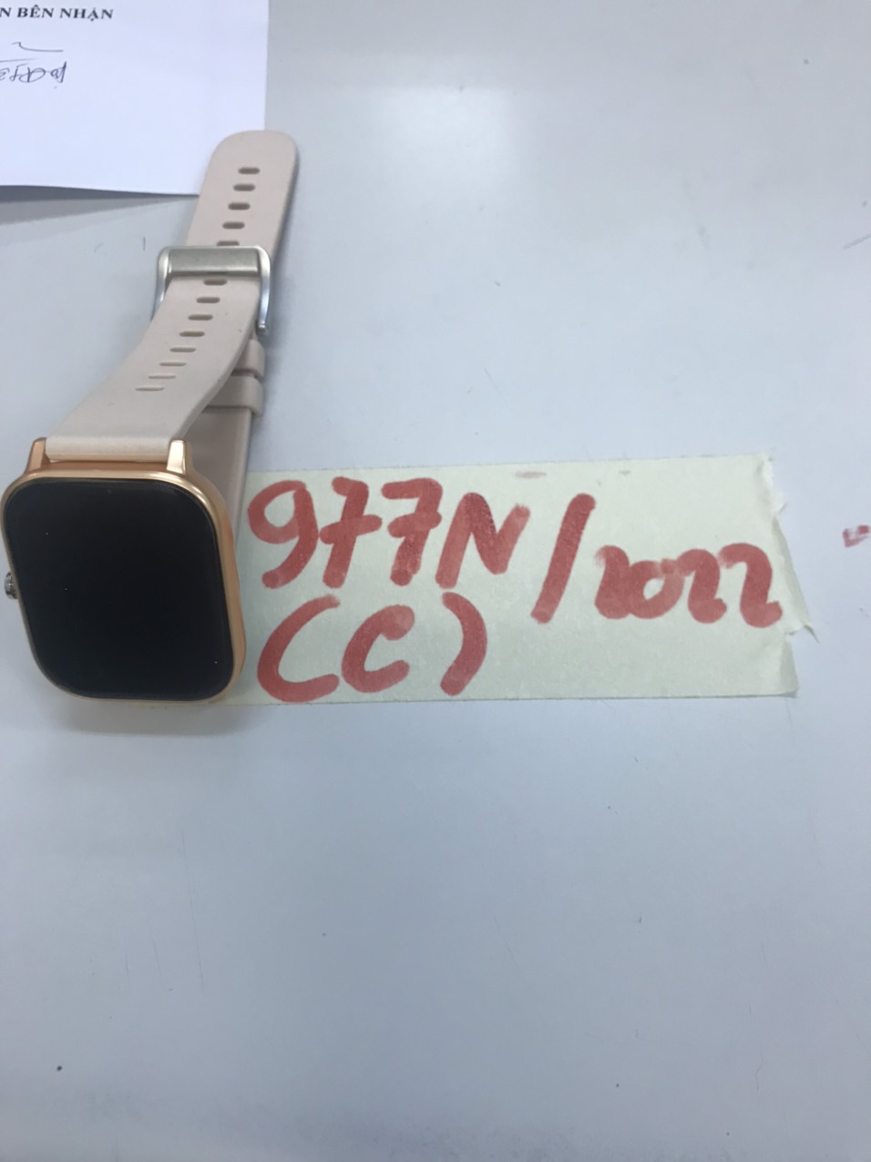 Ngày tiếp nhận: 18/10/2022 Mô tả: 01 đồng hồ dây cao su màu hồng nhạt, mặt vuông. Vị trí: An ninh soi chiếu quốc nội |