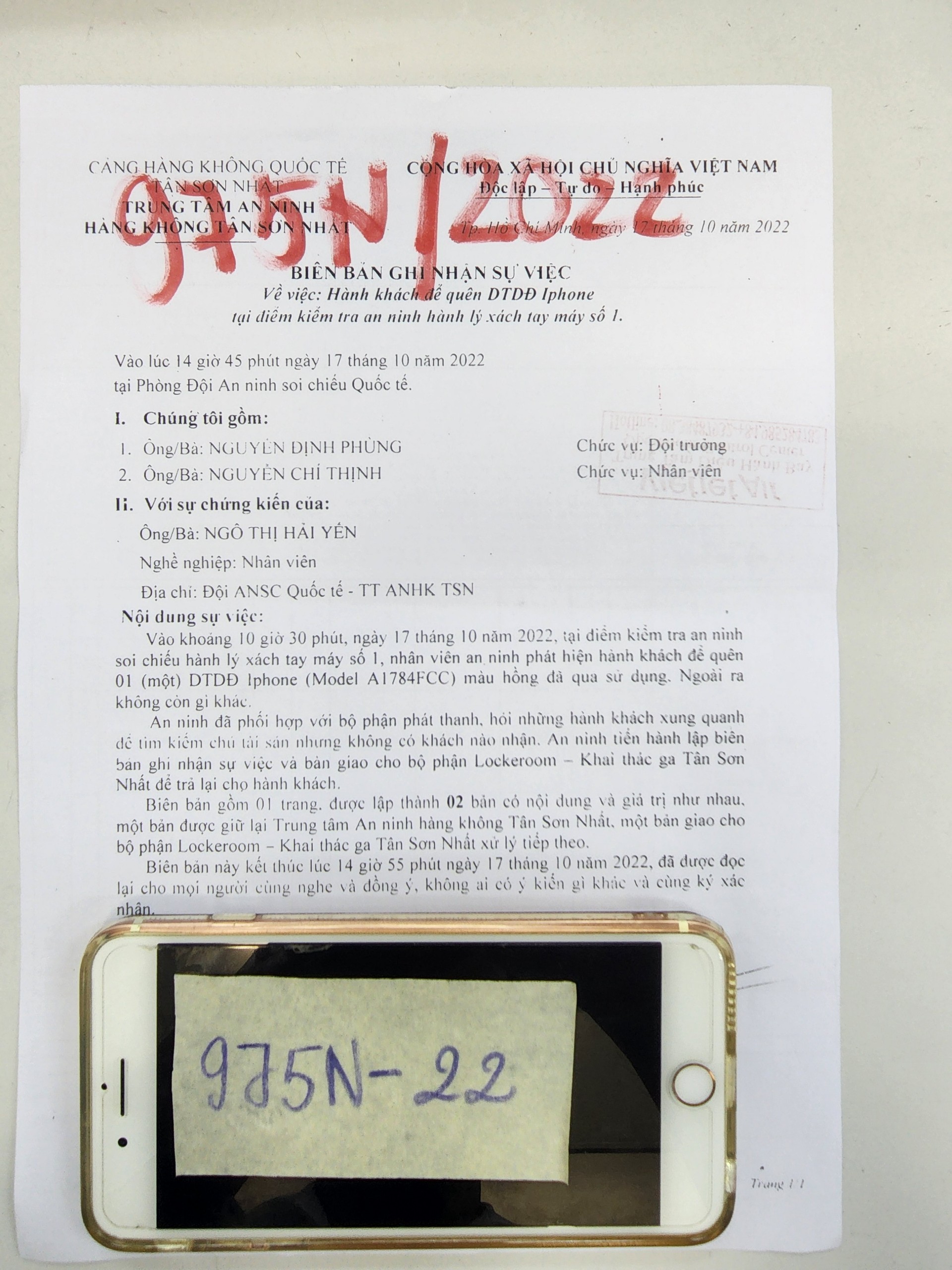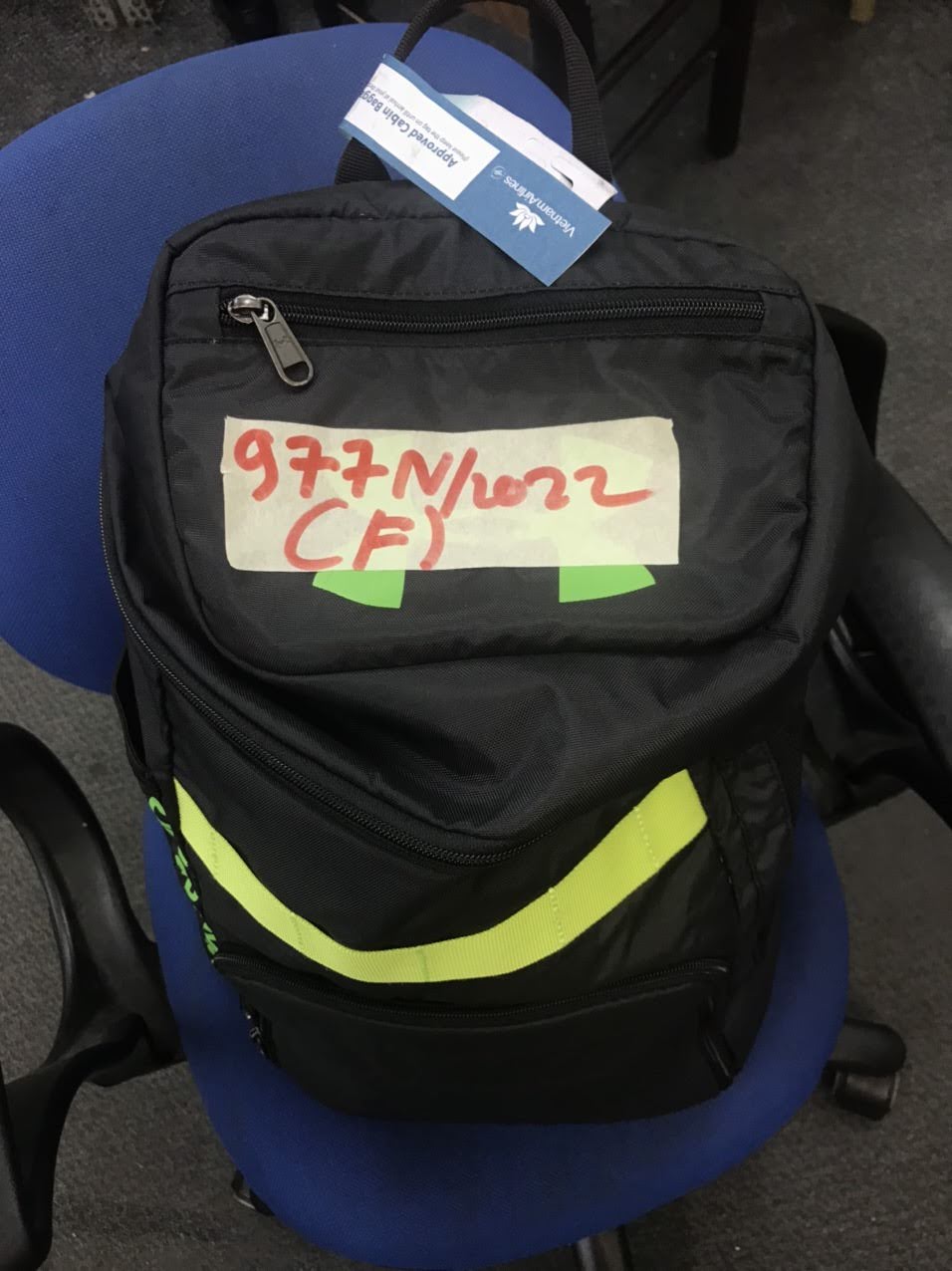 Ngày tiếp nhận: 20/10/2022 Mô tả: 01 balo đen có 01 CCCD, 02 thẻ ngân hàng Nguyễn Thị Bích Ngọc và đồ dùng đã sử dụng. Vị trí: An ninh soi chiếu quốc nội |
