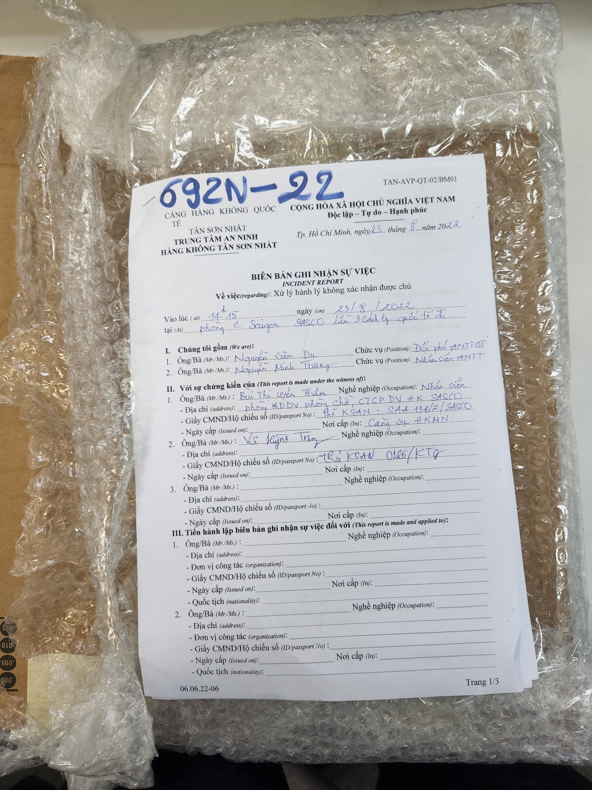 Ngày tiếp nhận: 24/8/2022 Mô tả: 01 túi màu đen bên trong có: Vị trí: An ninh soi chiếu quốc nội |