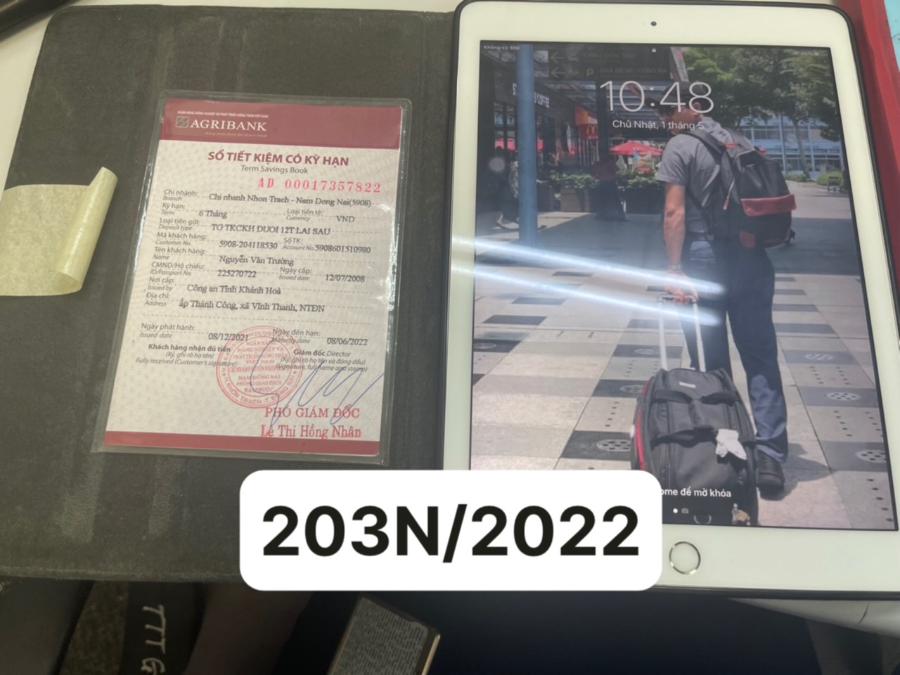 Ngày tiếp nhận: 01/05/2022 Mô tả: 01 Ipad màu vàng và sổ tiết kiệm Nguyễn Văn Trường. Vị trí: An ninh trật tự quốc nội |