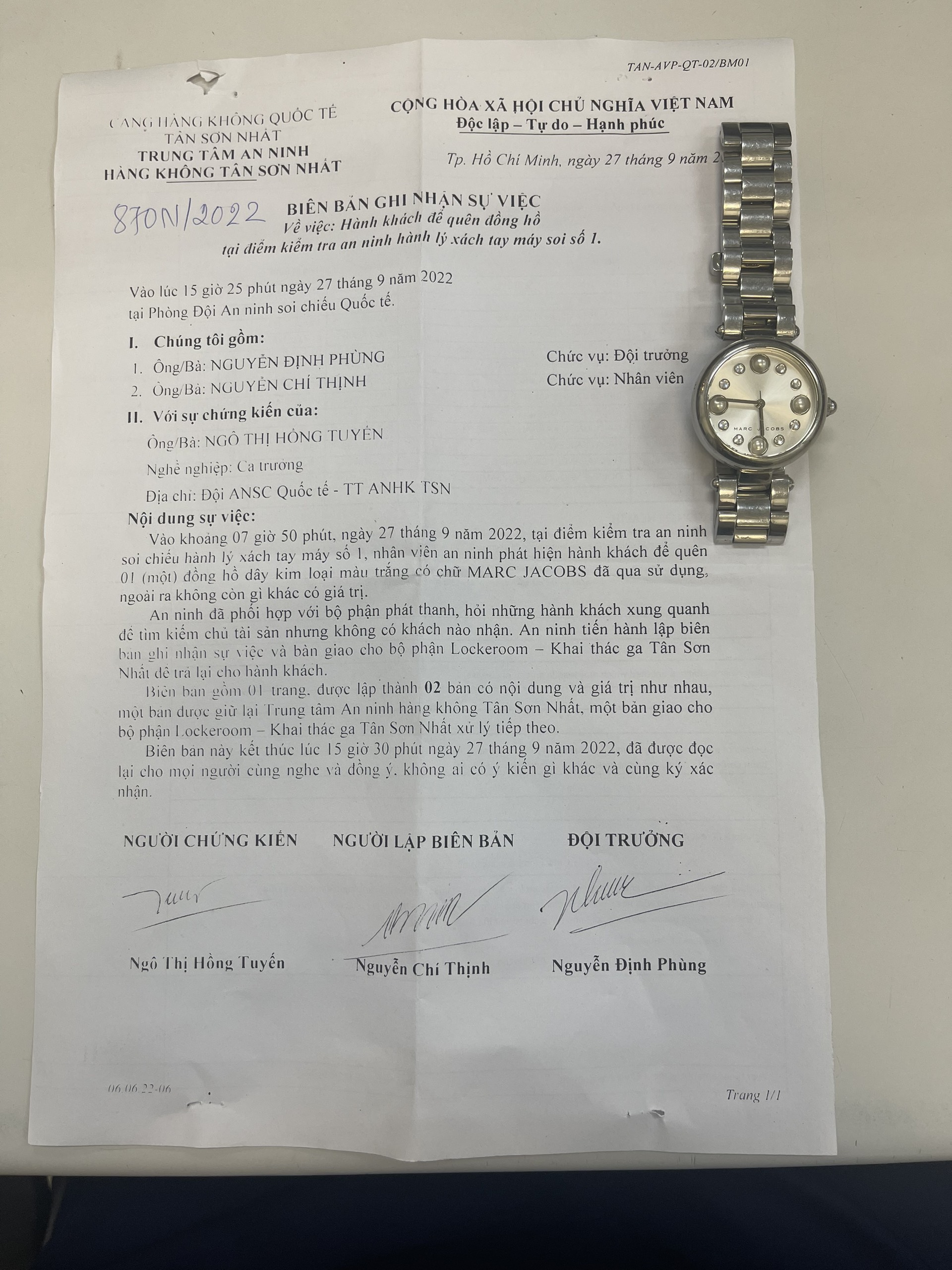 Ngày tiếp nhận: 30/9/2022 Mô tả: 01 đồng hồ dây kim loại màu trắng có chữ MARC JACOBS đã sử dụng . Vị trí: An ninh soi chiếu quốc tế |