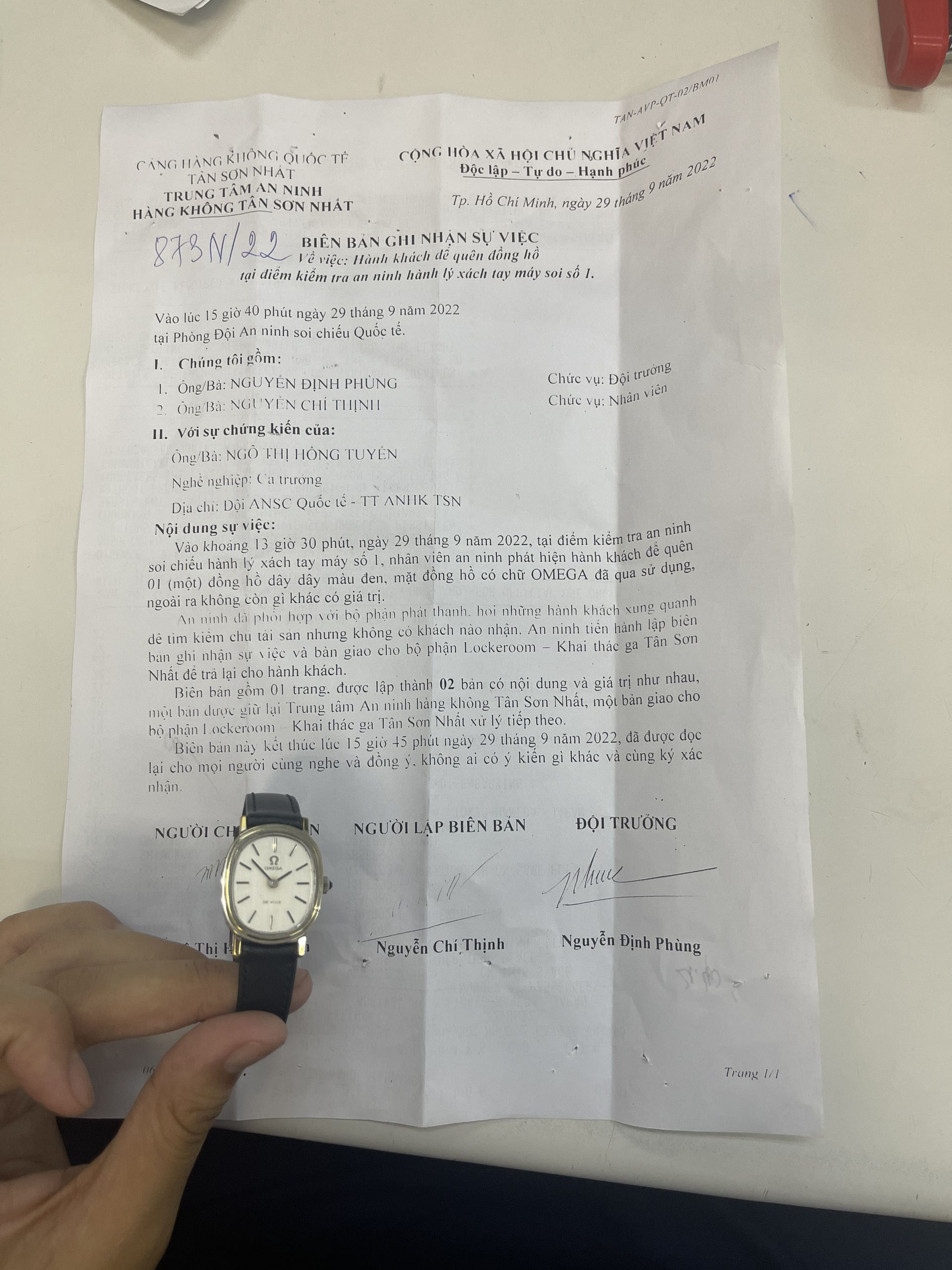 Ngày tiếp nhận: 30/9/2022 Mô tả: 01 đồng hồ dây màu đen, mặt đồng hồ có chữ OMEGA đã sử dụng . Vị trí: An ninh soi chiếu quốc tế |