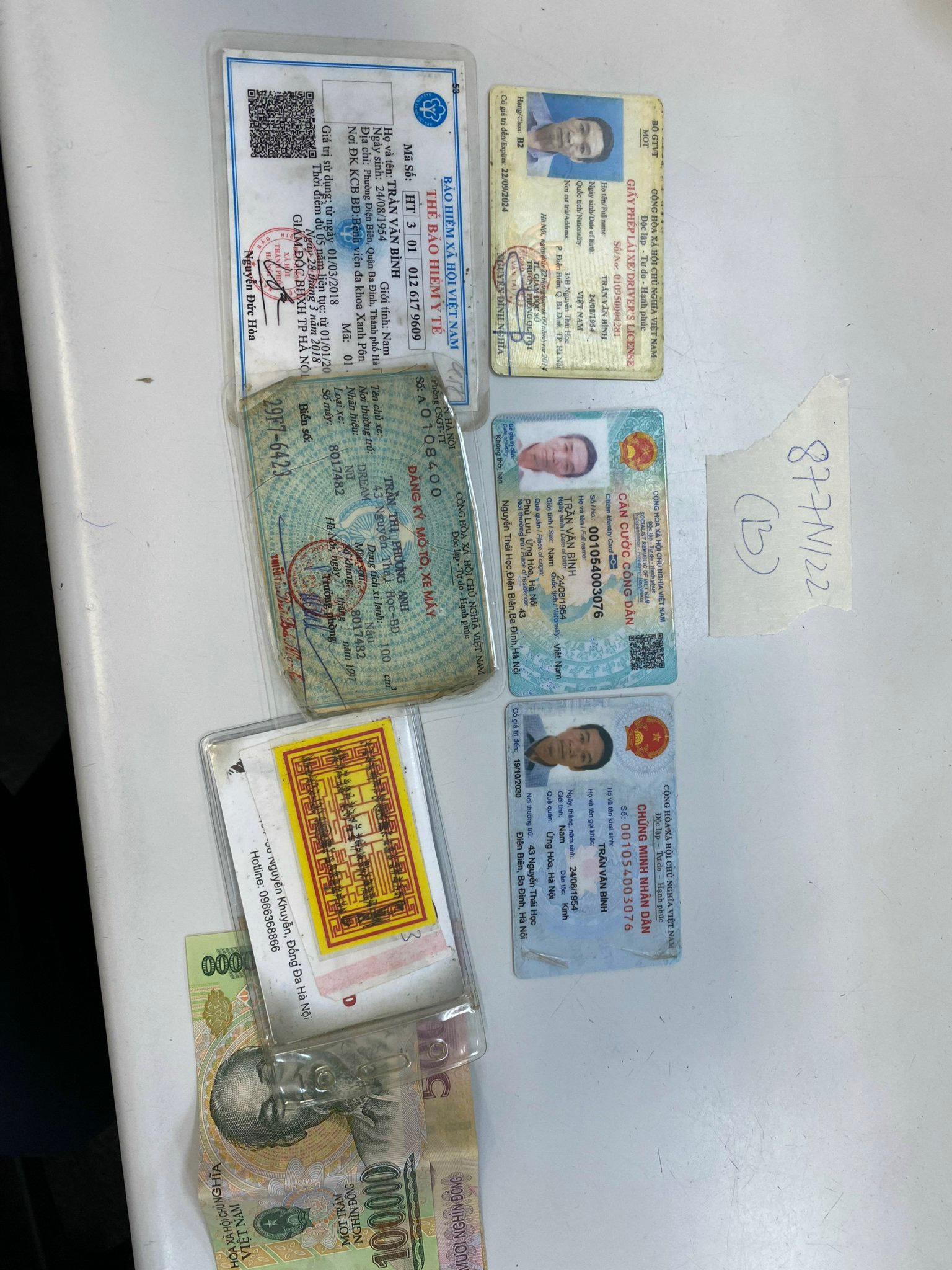 Ngày tiếp nhận: 30/9/2022 Mô tả: 01 Giấy tờ bao gồm: 01 CCCD, 01BHYT, 01 CMND, 01 GPLX mang tên "Trần Văn Bình" , 01 carvet xe mang tên " Trần Thị Hương Anh" và 170.000VNĐ. Vị trí: An ninh soi chiếu quốc nội |