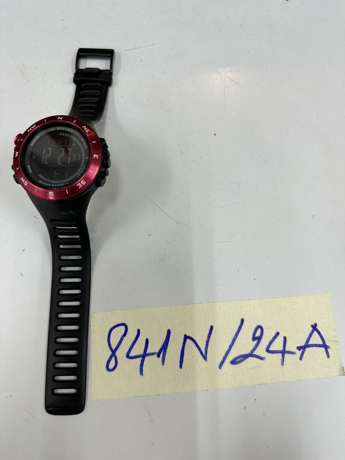 Ngày tiếp nhận: 31/5/2024 Mã hồ sơ: 841N2024A Mô tả: 01 đồng hồ màu đen mặt tròn màu đỏ dây cao su có ghi chữ "LAD WEATHER". |