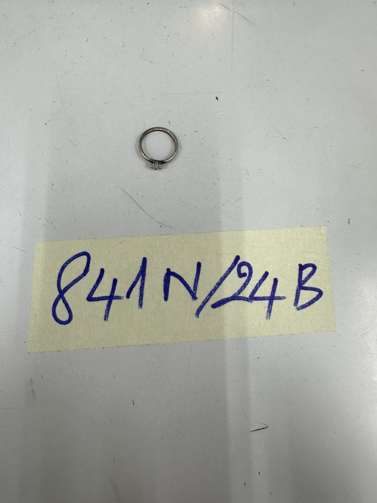 Ngày tiếp nhận: 31/5/2024 Mã hồ sơ: 841N2024B Mô tả: 01 nhẫn kim loại màu trắng đính đá màu trắng. |