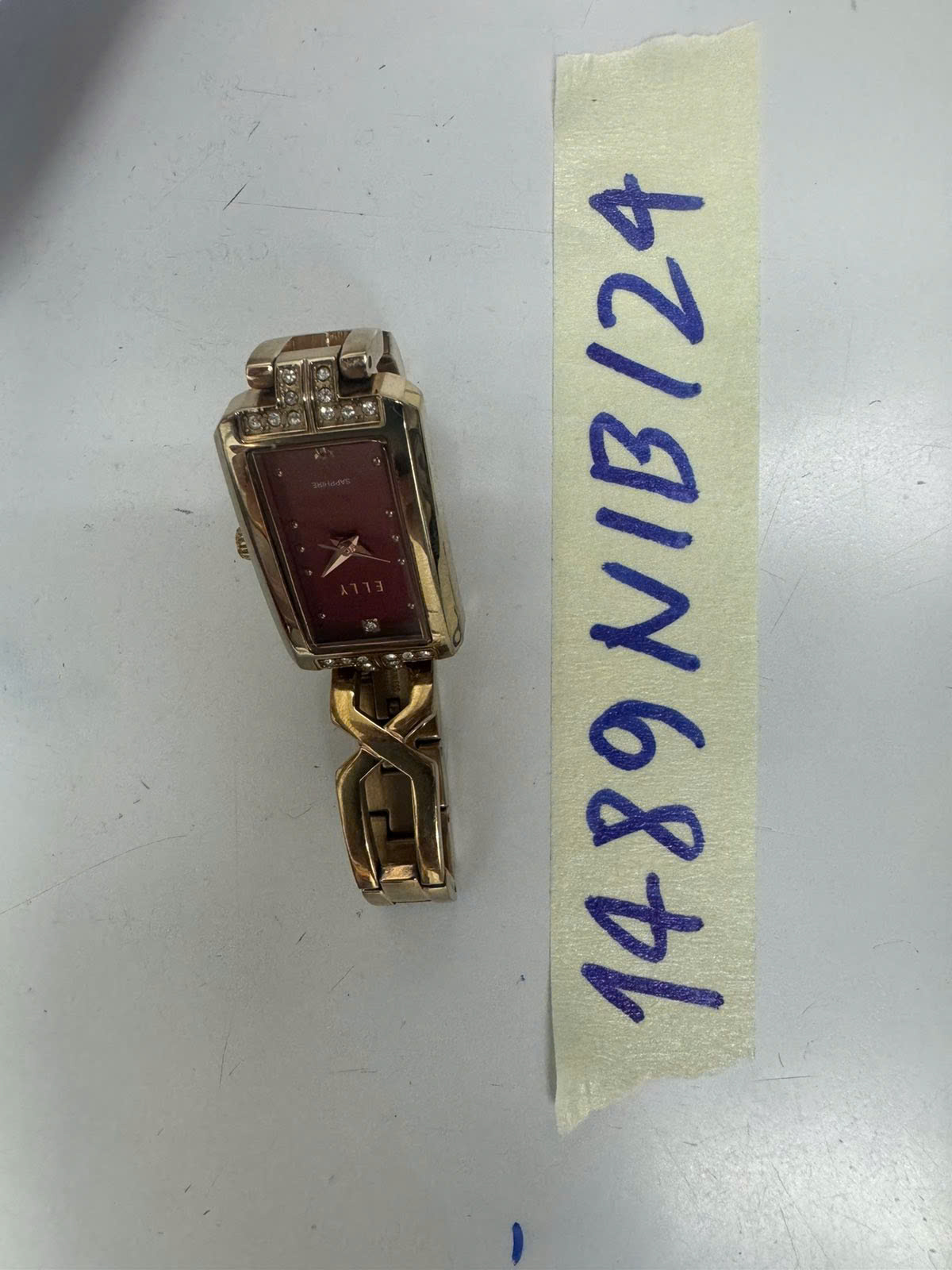 Ngày tiếp nhận: 02/9/2024 Mã hồ sơ: 1489N2024B Mô tả: 01 đồng hồ dây kim loại màu vàng-hồng, mặt hình chữ nhật có chữ ELLY đã qua sử dụng. |