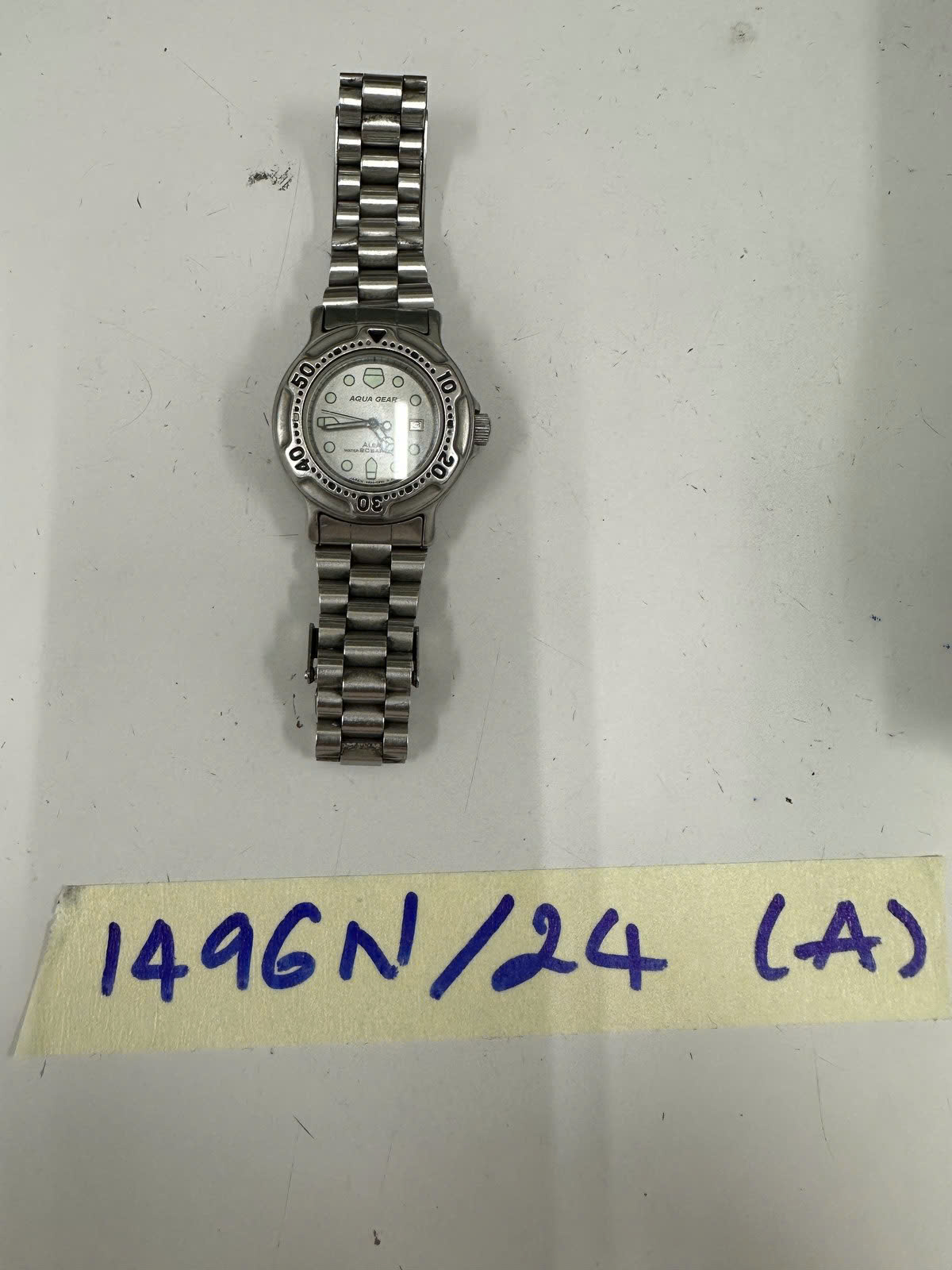 Ngày tiếp nhận: 03/9/2024 Mã hồ sơ: 1496N2024A Mô tả: 01 đồng hồ dây kim loại màu trắng mặt trắng bên trên có chữ AQUA GEAR. |