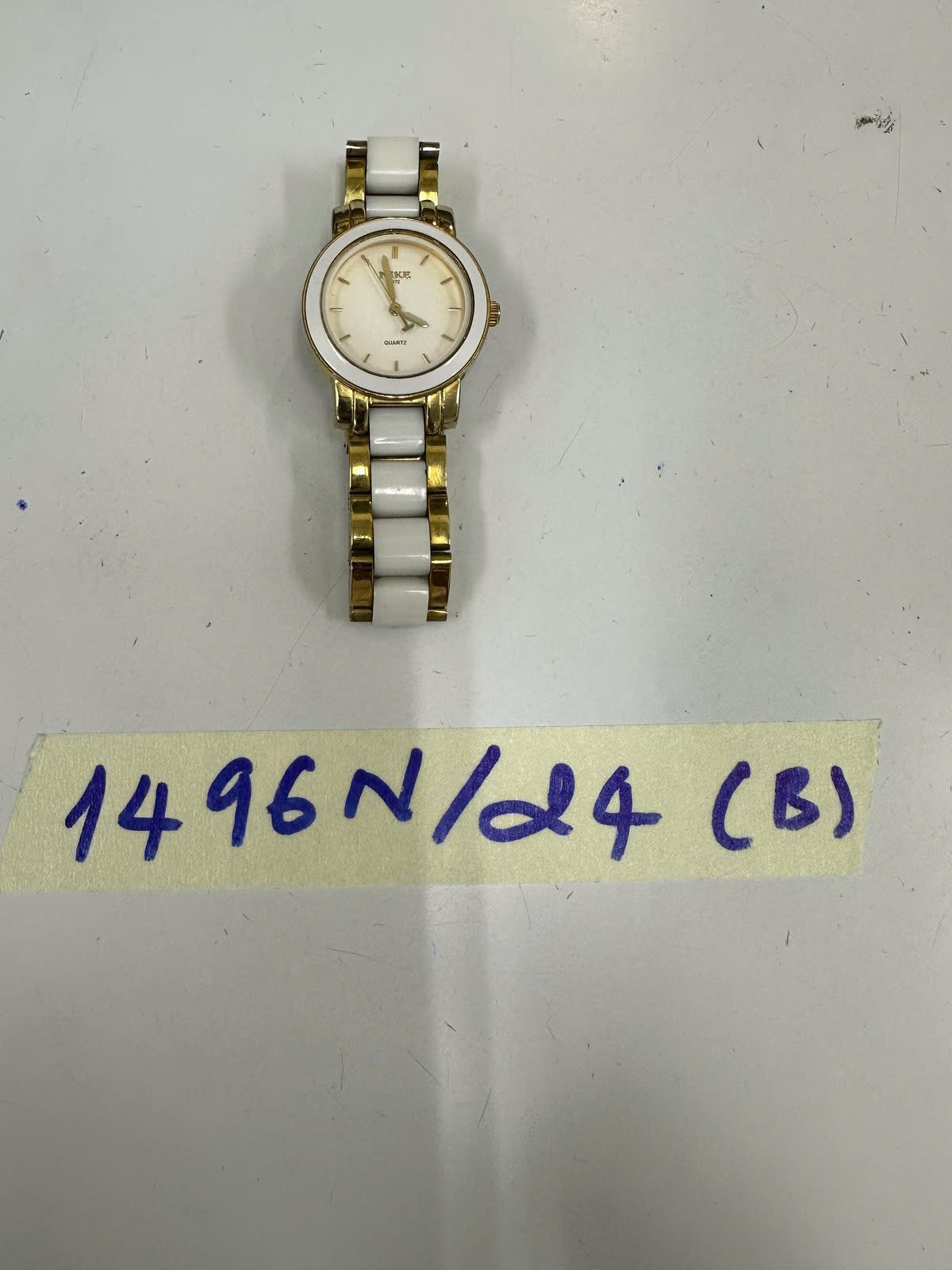 Ngày tiếp nhận: 03/9/2024 Mã hồ sơ: 1496N2024B Mô tả: 01 đồng hồ dây kim loại màu vàng và trắng có chữ MIKE. |