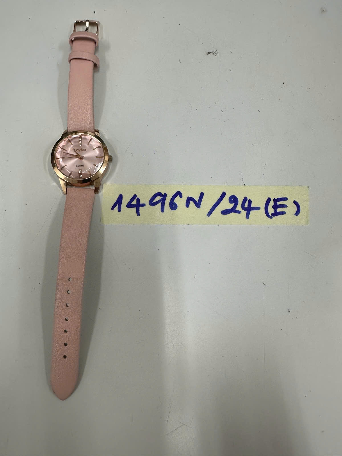 Ngày tiếp nhận: 03/9/2024 Mã hồ sơ: 1496N2024E Mô tả: 01 đồng hồ dây da màu hồng mặt màu hồng có chữ Lovito. |
