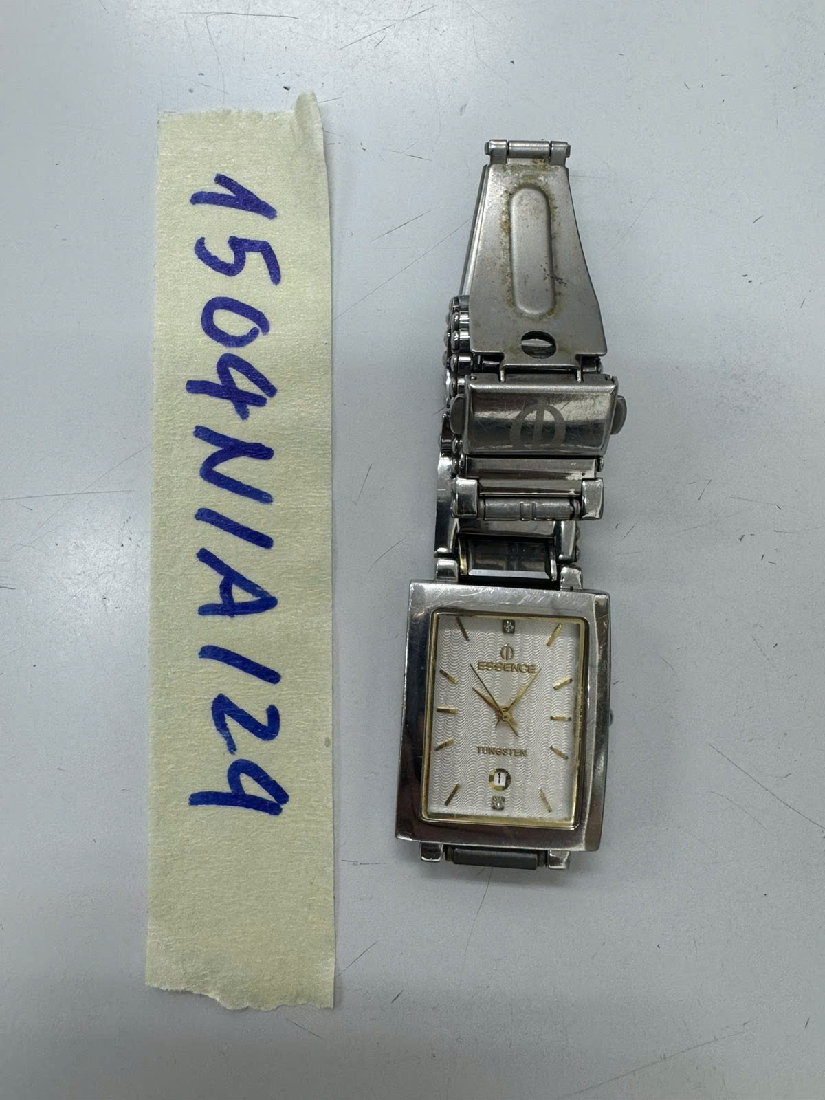 Ngày tiếp nhận: 05/9/2024 Mã hồ sơ: 1504N2024A Mô tả: 01 đồng hồ hiệu ESSENCE mặt chữ nhật, màu bạc, kim màu vàng đã qua sử dụng. |