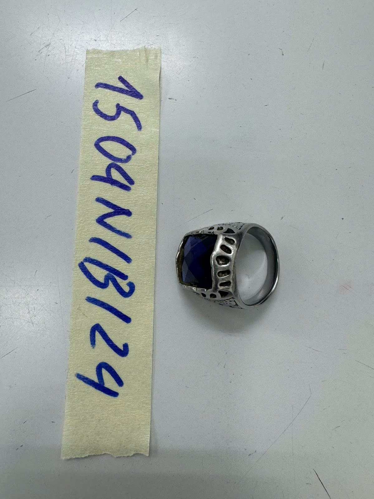 Ngày tiếp nhận: 05/9/2024 Mã hồ sơ: 1504N2024B Mô tả: 01 nhẫn kim loại màu bạc bên trên có đính hạt màu xanh đã qua sử dụng. |