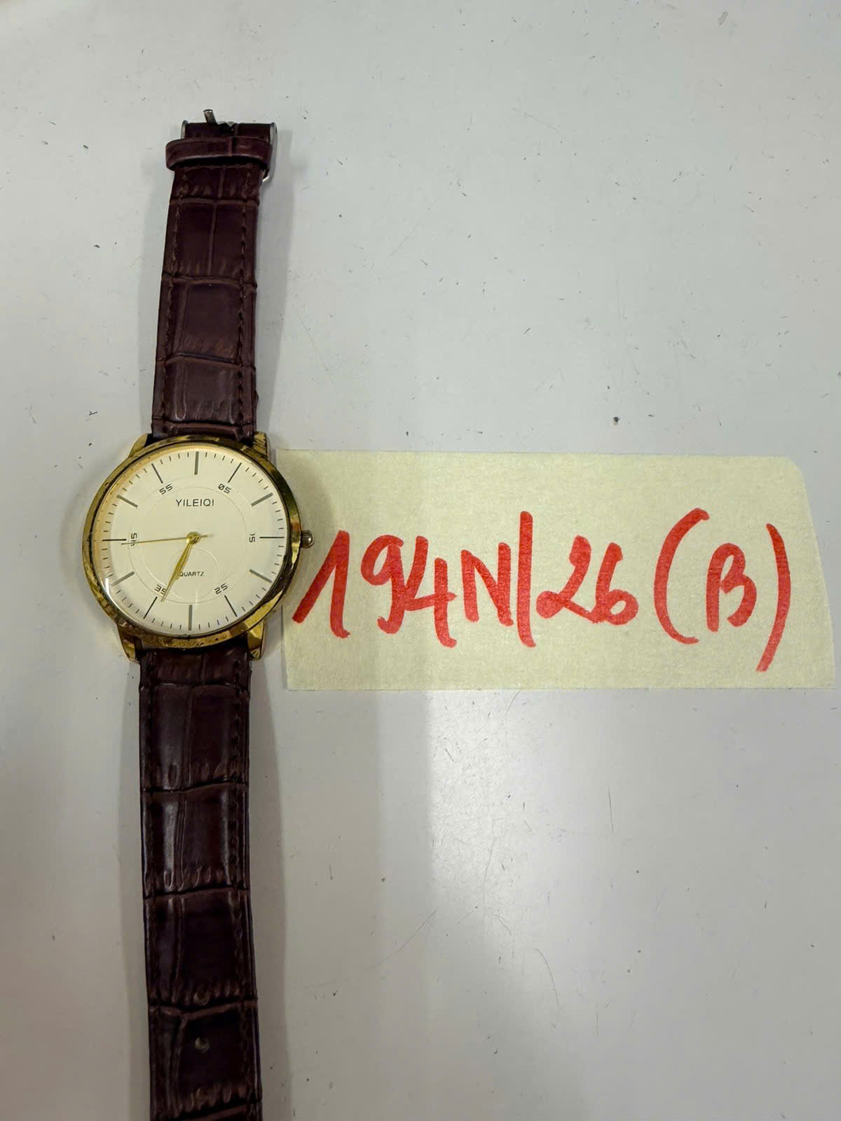 Ngày tiếp nhận: 04/02/2026 Mã hồ sơ: 194N2026B Mô tả: 01 đồng hồ kim loại màu vàng, mặt trong chữ YILEIQI, dây giống da màu nâu. |