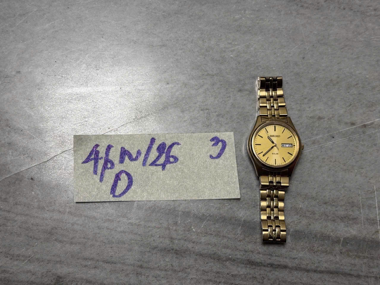 Ngày tiếp nhận: 03/02/2026 Mã hồ sơ: 46N2026D-T3 Mô tả: 01 đồng hồ kim loại vàng chữ SEIKO. |