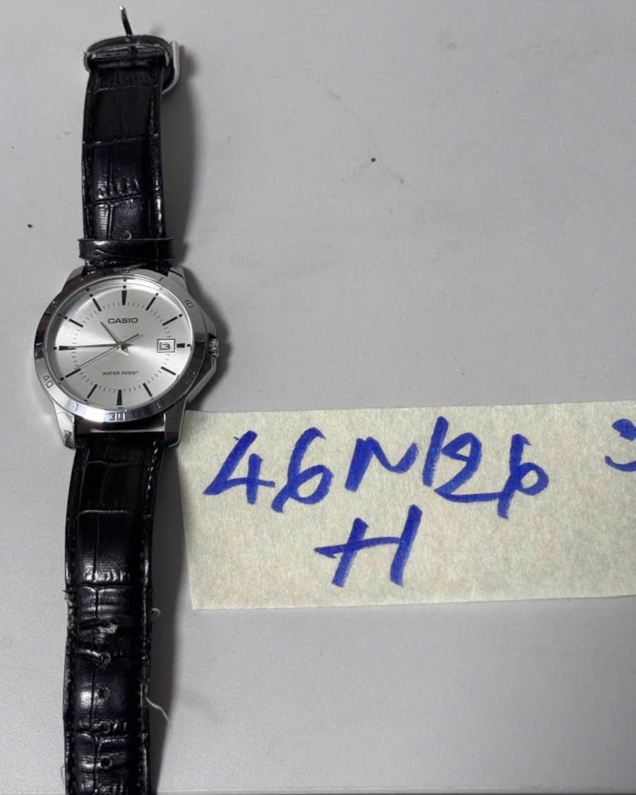 Ngày tiếp nhận: 03/02/2026 Mã hồ sơ: 46N2026H-T3 Mô tả: 01 đồng hồ mặt tròn màu trắng CASIO dây da màu đen. |