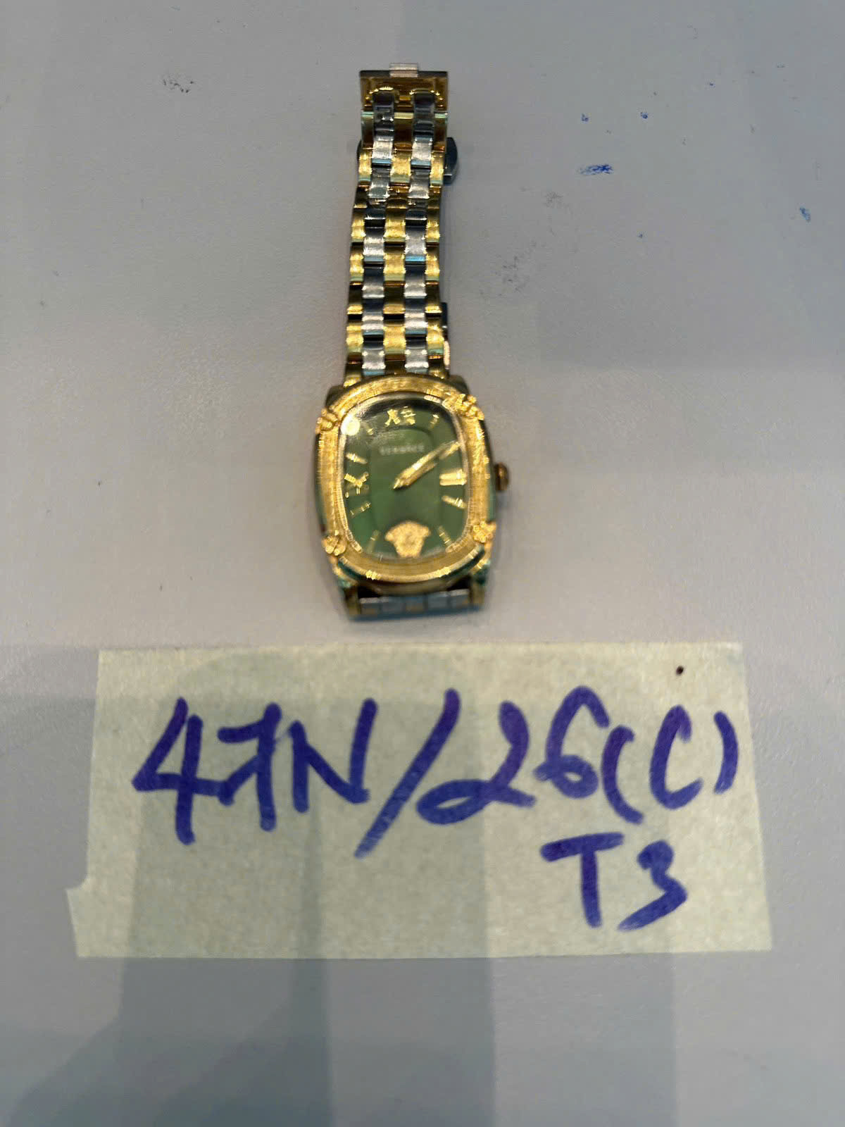 Ngày tiếp nhận: 04/02/2026 Mã hồ sơ: 47N2026C-T3 Mô tả: 01 đồng hồ kim loại mặt vuông chữ VERSACE. |