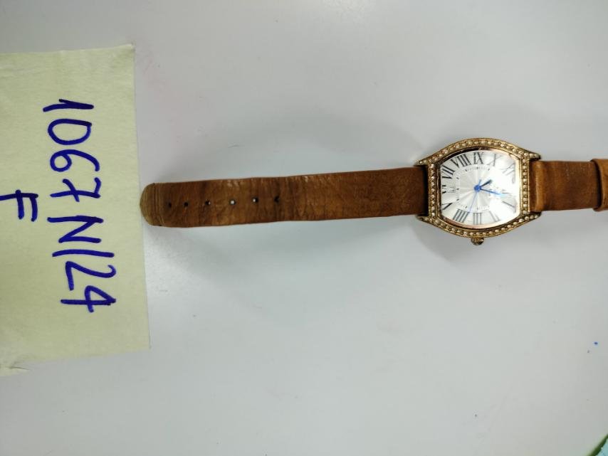 Ngày tiếp nhận: 05/7/2024 Mã hồ sơ: 1067N2024F Mô tả: 01 đồng hồ cơ dây da màu nâu mặt đồng hồ có đính đá có chữ Da Nuo. |