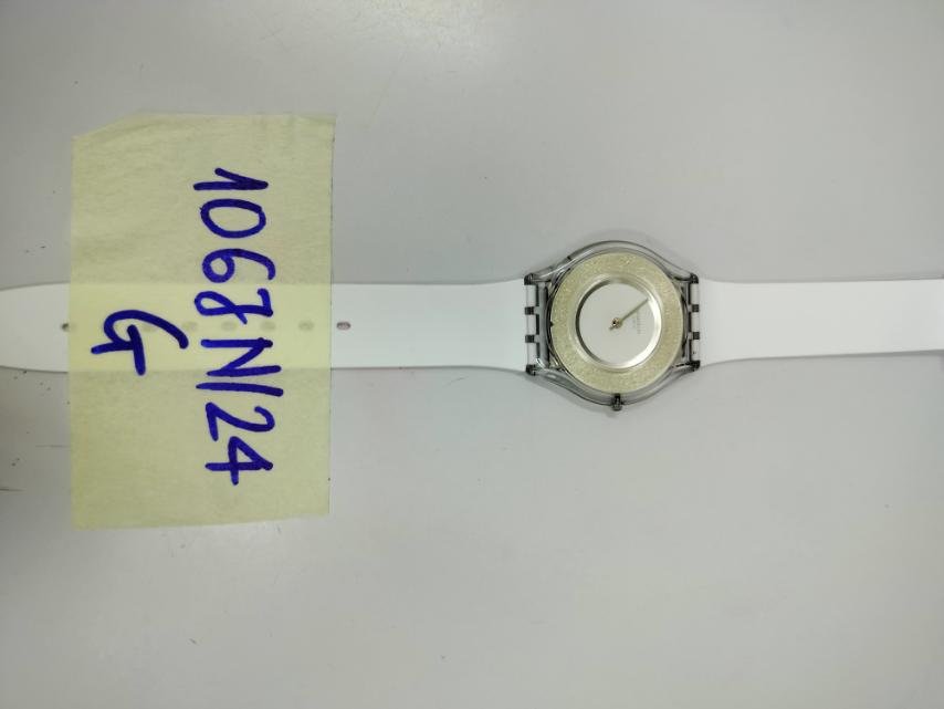 Ngày tiếp nhận: 05/7/2024 Mã hồ sơ: 1067N2024G Mô tả: 01 đồng hồ dây cao su màu trắng, mặt tròn có chữ Swatch swiss. |