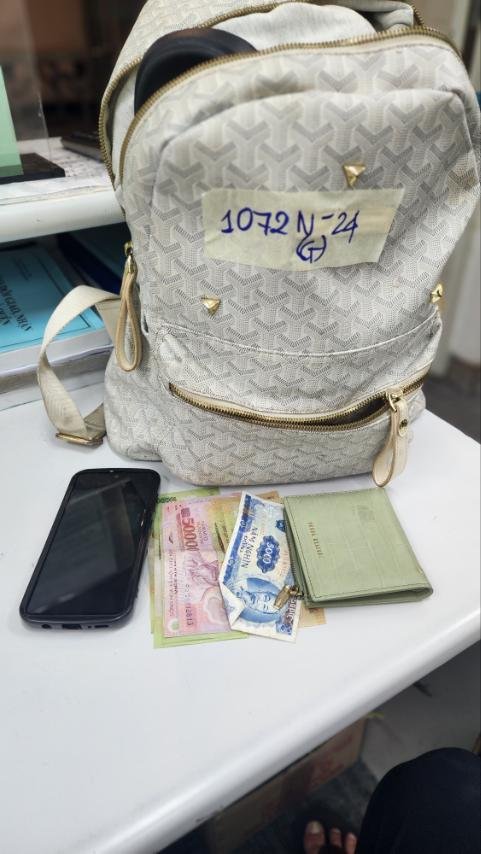 Ngày tiếp nhận: 06/7/2024 Mã hồ sơ: 1072N2024G Mô tả: 01 balo màu trắng có chữ EDMOND MASION bên trong có chứa 01 điện thoại hiệu SAMSUNG màu đen có ốp lưng màu đen hồng, 01 túi màu hồng chứa mỹ phẩm, giấy tờ tùy thân, đồ dùng cá nhân, 01 ví màu xanh có chữ Forever Young chứa 04 tờ 100.000 VNĐ, 02 tờ mệnh giá 50.000 VNĐ, 03 tờ mệnh giá 10.000 VNĐ, 01 tờ mệnh giá 5.000 VNĐ. |