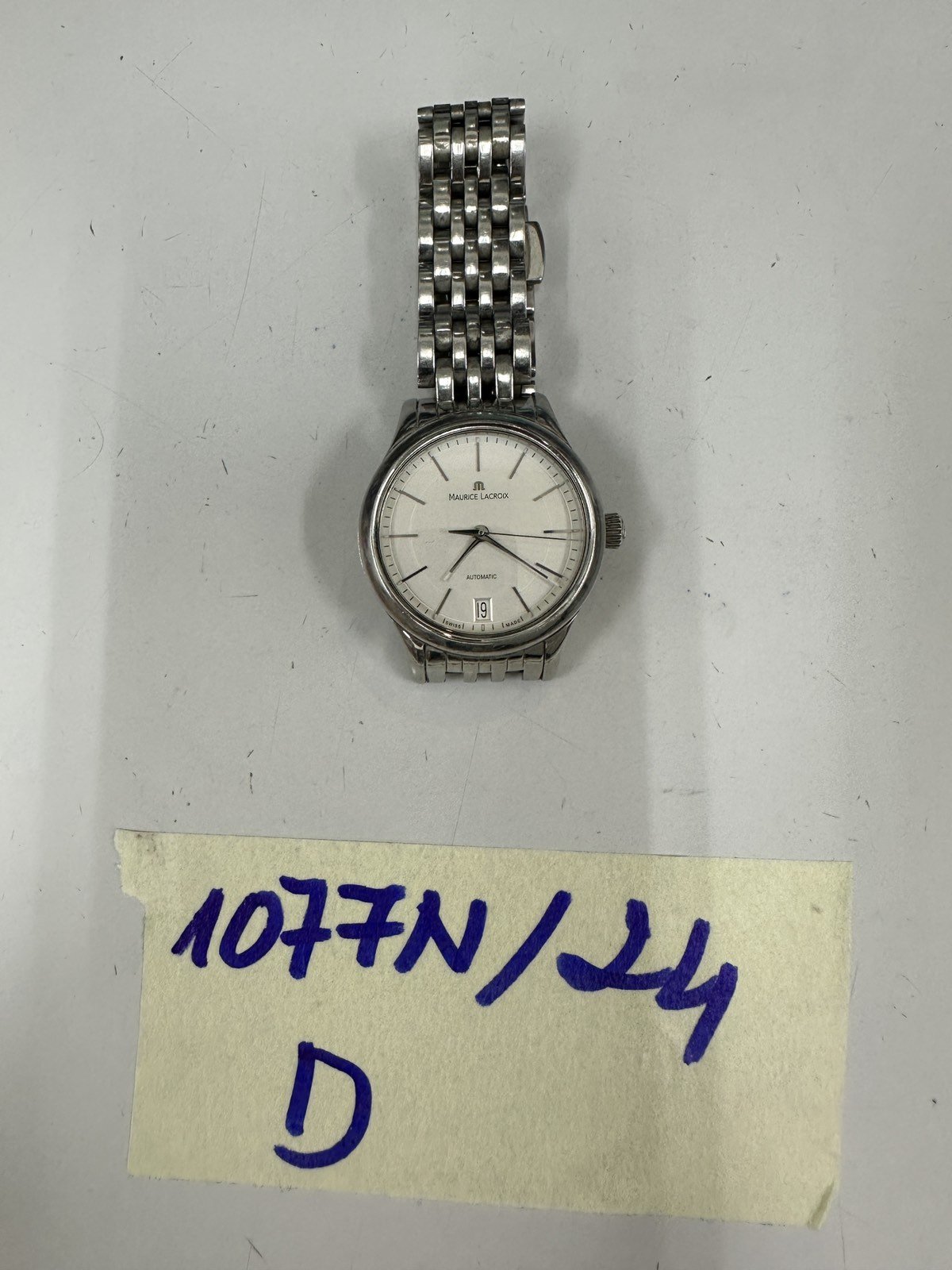 Ngày tiếp nhận: 07/7/2024 Mã hồ sơ: 1077N2024D Mô tả: 01 đồng hồ màu trắng kim loại mặt trên có chữ MAURICE LACROIX. |