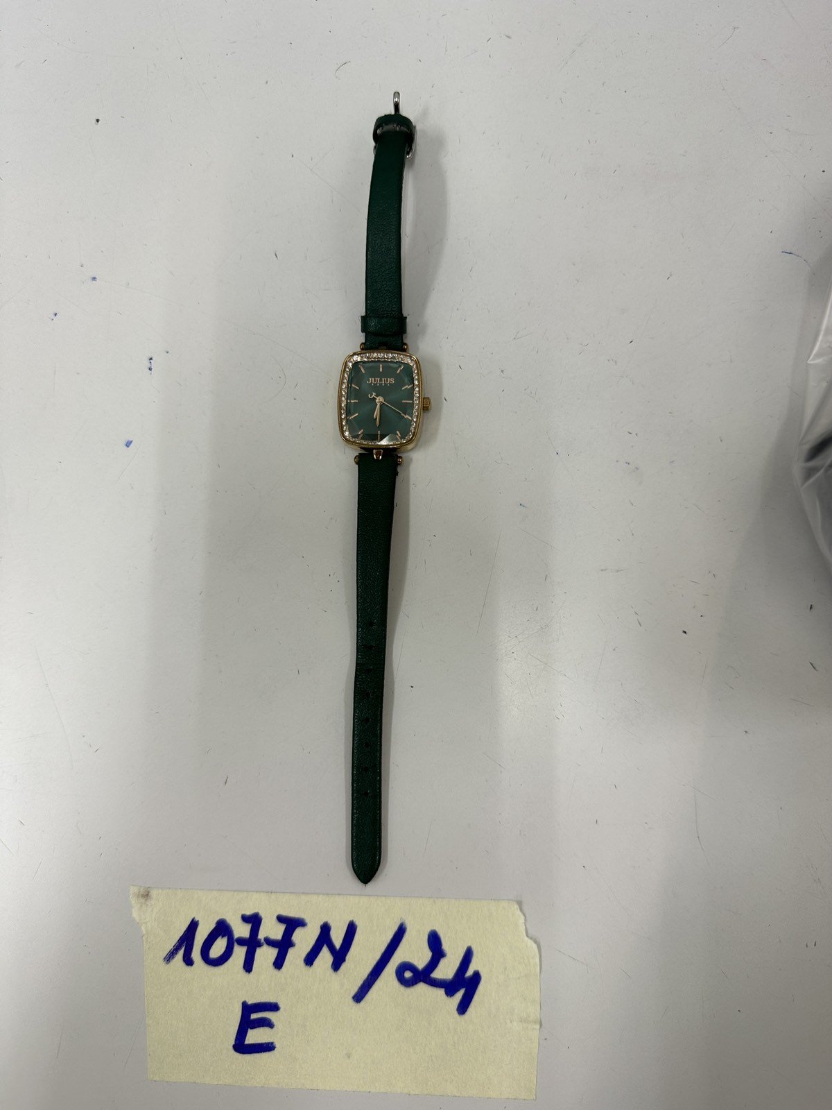Ngày tiếp nhận: 07/7/2024 Mã hồ sơ: 1077N2024E Mô tả: 01 đồng hồ dây da màu xanh, mặt xanh có chữ JULIUX. |