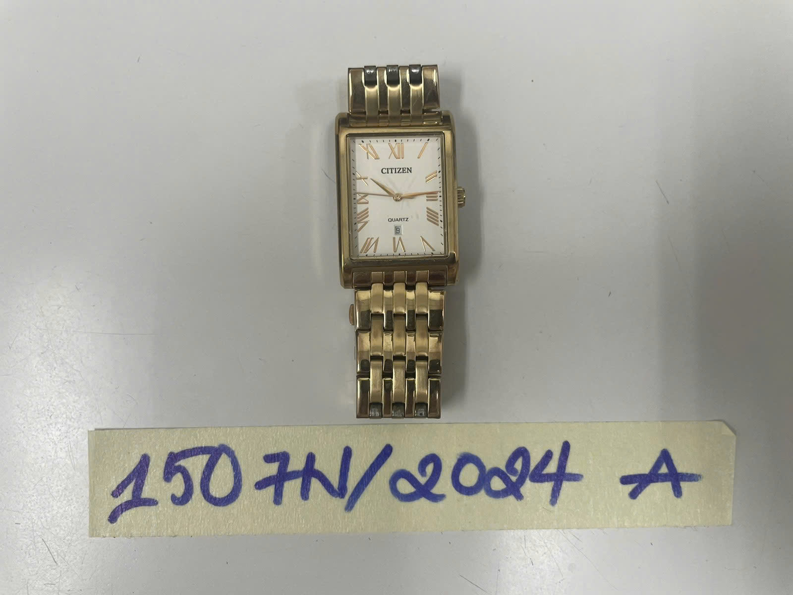 Ngày tiếp nhận: 06/9/2024 Mã hồ sơ: 1507N2024A Mô tả: 01 đồng hồ CITIZEN mặt trắng viền và dây kim loại màu vàng. |