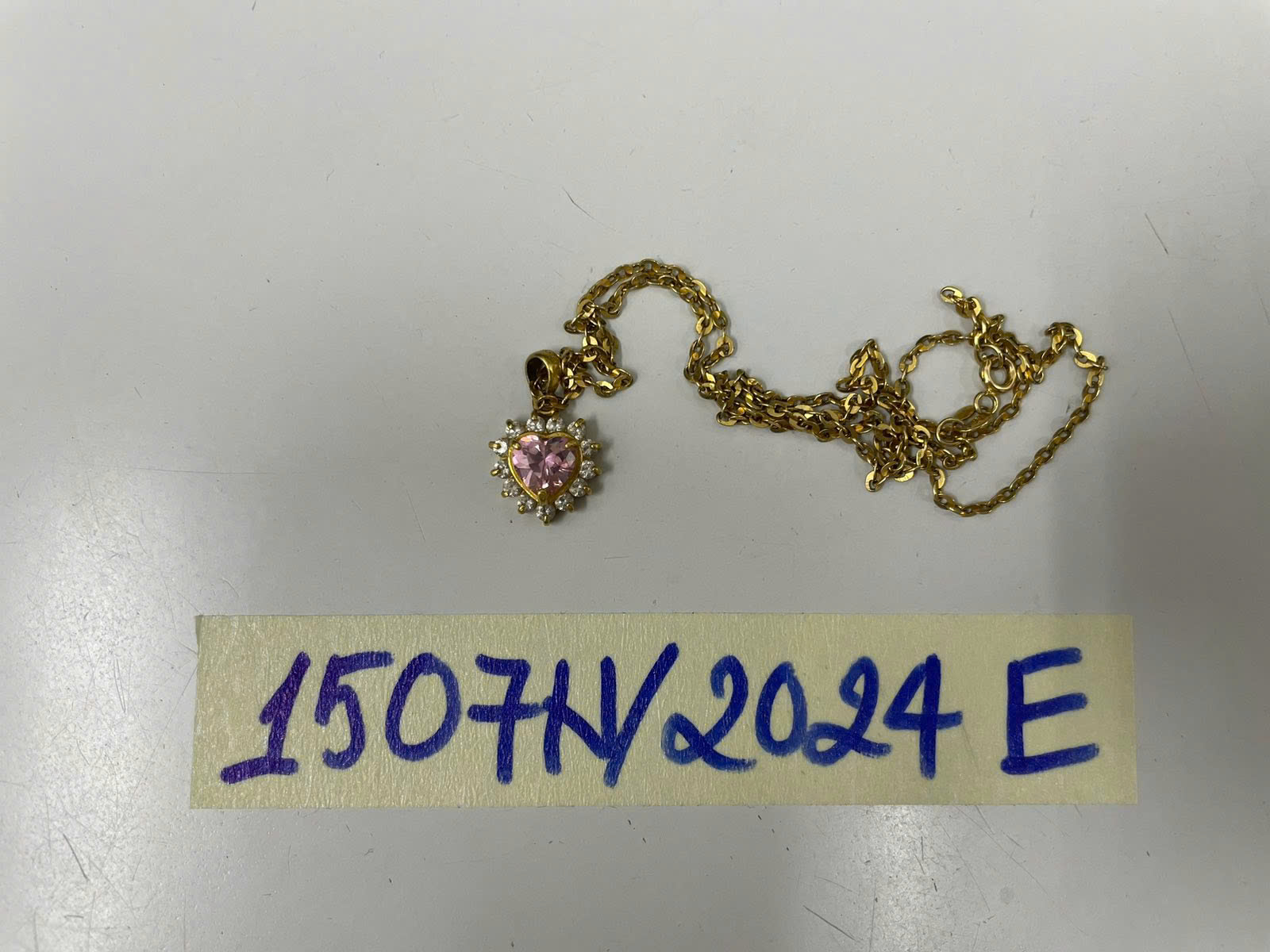 Ngày tiếp nhận: 06/9/2024 Mã hồ sơ: 1507N2024E Mô tả: 01 dây chuyền kim loại màu vàng, mặt dây chuyền có đính đá màu tím. |