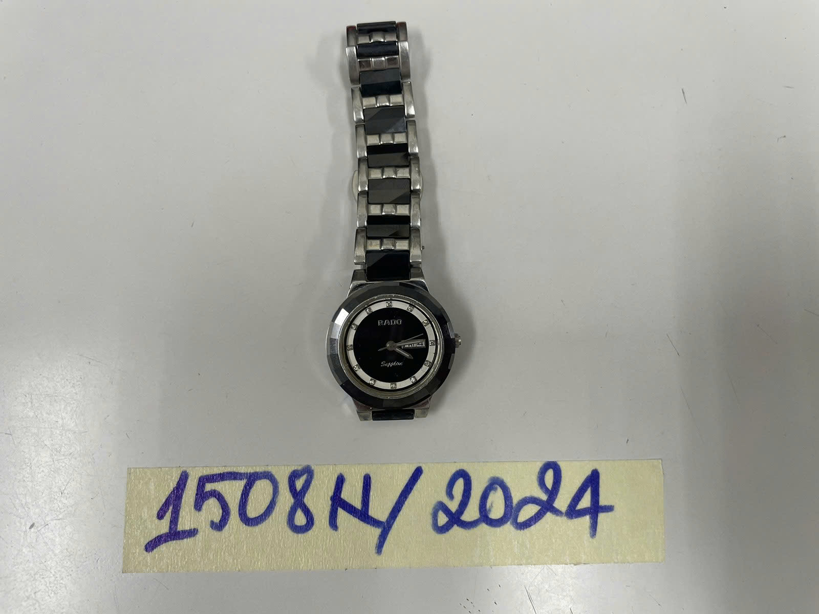 Ngày tiếp nhận: 06/9/2024 Mã hồ sơ: 1508N2024 Mô tả: 01 đồng hồ đeo tay bằng kim loại màu trắng có chữ RADO Shapphire. |