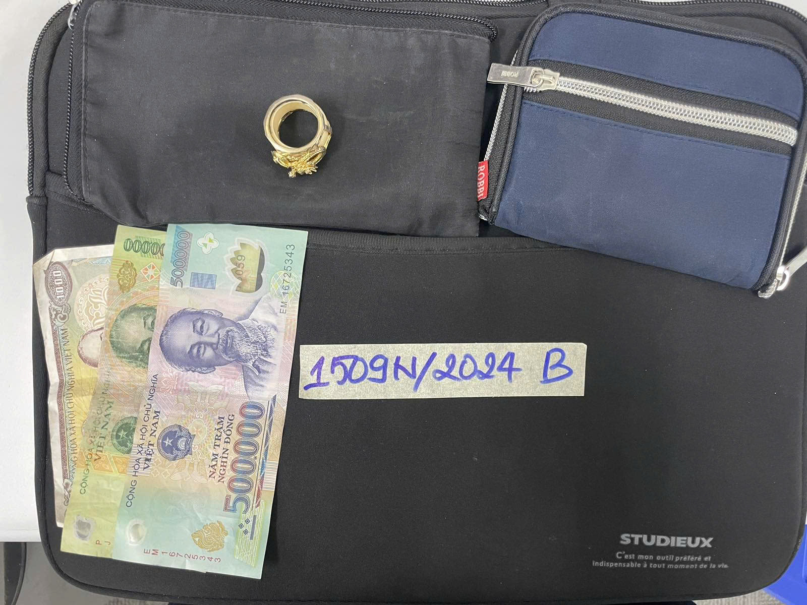 Ngày tiếp nhận: 06/9/2024 Mã hồ sơ: 1509N2024B Mô tả: 02 túi xách màu đen, chữ STUDIEUX bên trong chứa 01 ví màu xanh bên trong có chứa một vài đồng xu bằng kim loại và 01 thẻ Debit mang tên Handa Seiji; 01 ví màu đen có một số tờ tiền với tổng mệnh giá 601,000 vnđ; 01 chiếc nhẫn kim loại màu vàng; điêu khắc hình con rồng, 01 Carvet mang tên HỒ LÂM PHÁT và một số vật dụng cá nhân. |