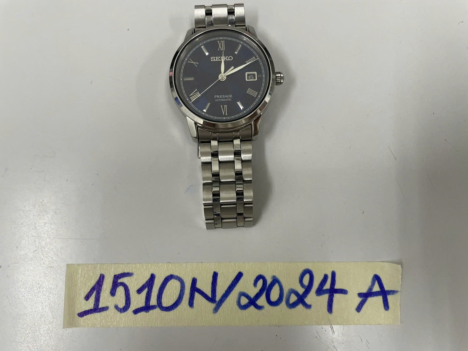 Ngày tiếp nhận: 06/9/2024 Mã hồ sơ: 1510N2024A Mô tả: 01 đồng hồ màu bạc, dây đeo kim loại màu bạc, có logo chữ "SEIKO PRESAGE". |