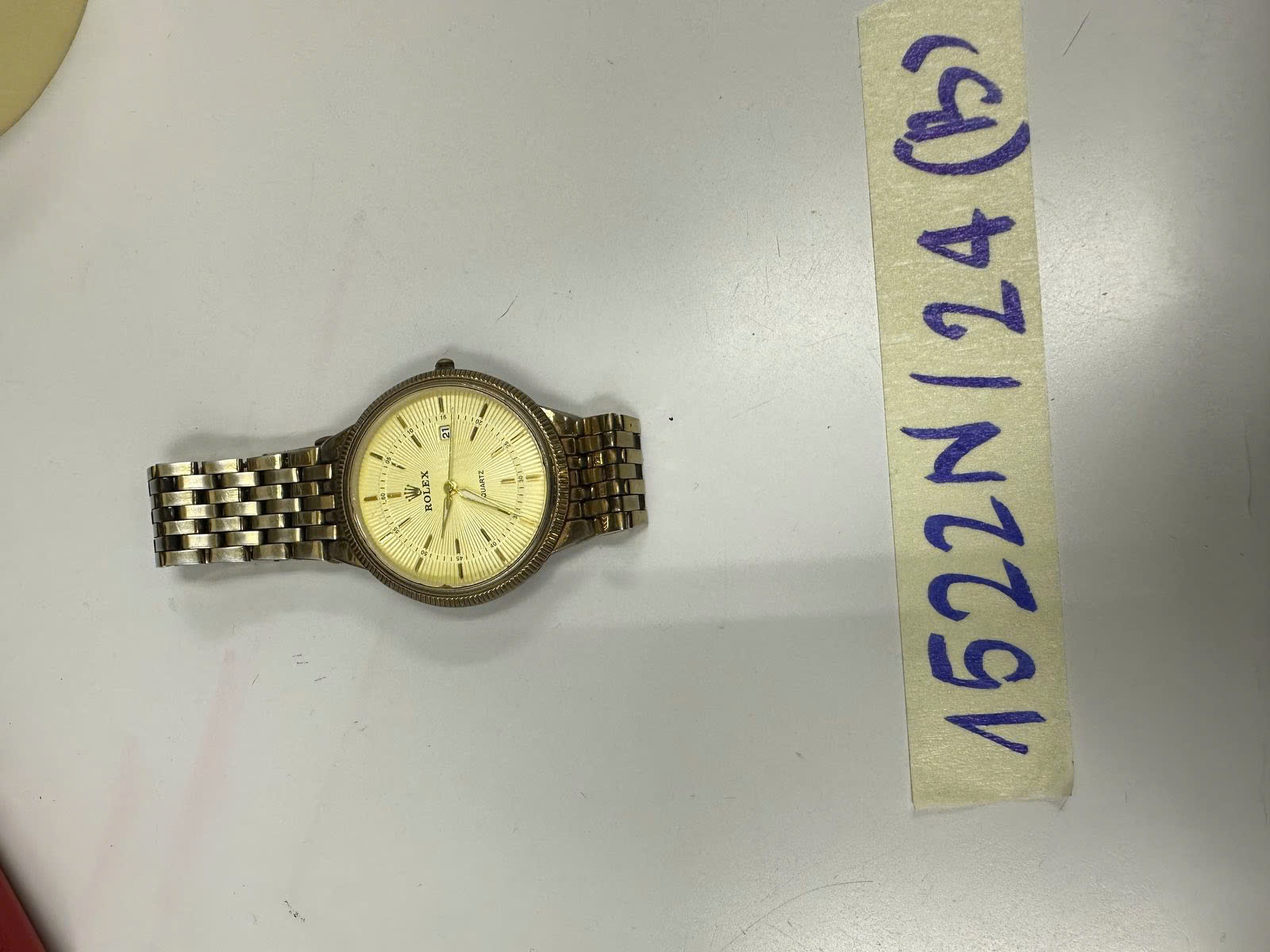 Ngày tiếp nhận: 09/9/2024 Mã hồ sơ: 1522N2024B Mô tả: 01 đồng hồ dây kim loại màu vàng có ghi chữ ROLEX. |