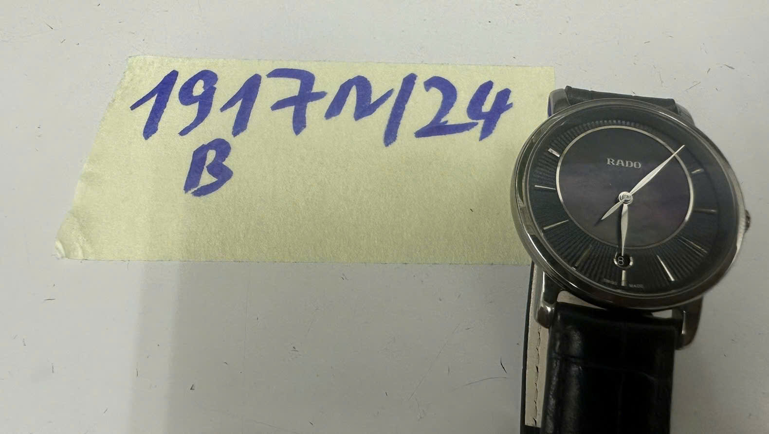 Ngày tiếp nhận: 08/11/2024 Mã hồ sơ: 1917N2024B Mô tả: 01 Đồng hồ dây da và mặt kim loại màu đen có chữ "Rado". |