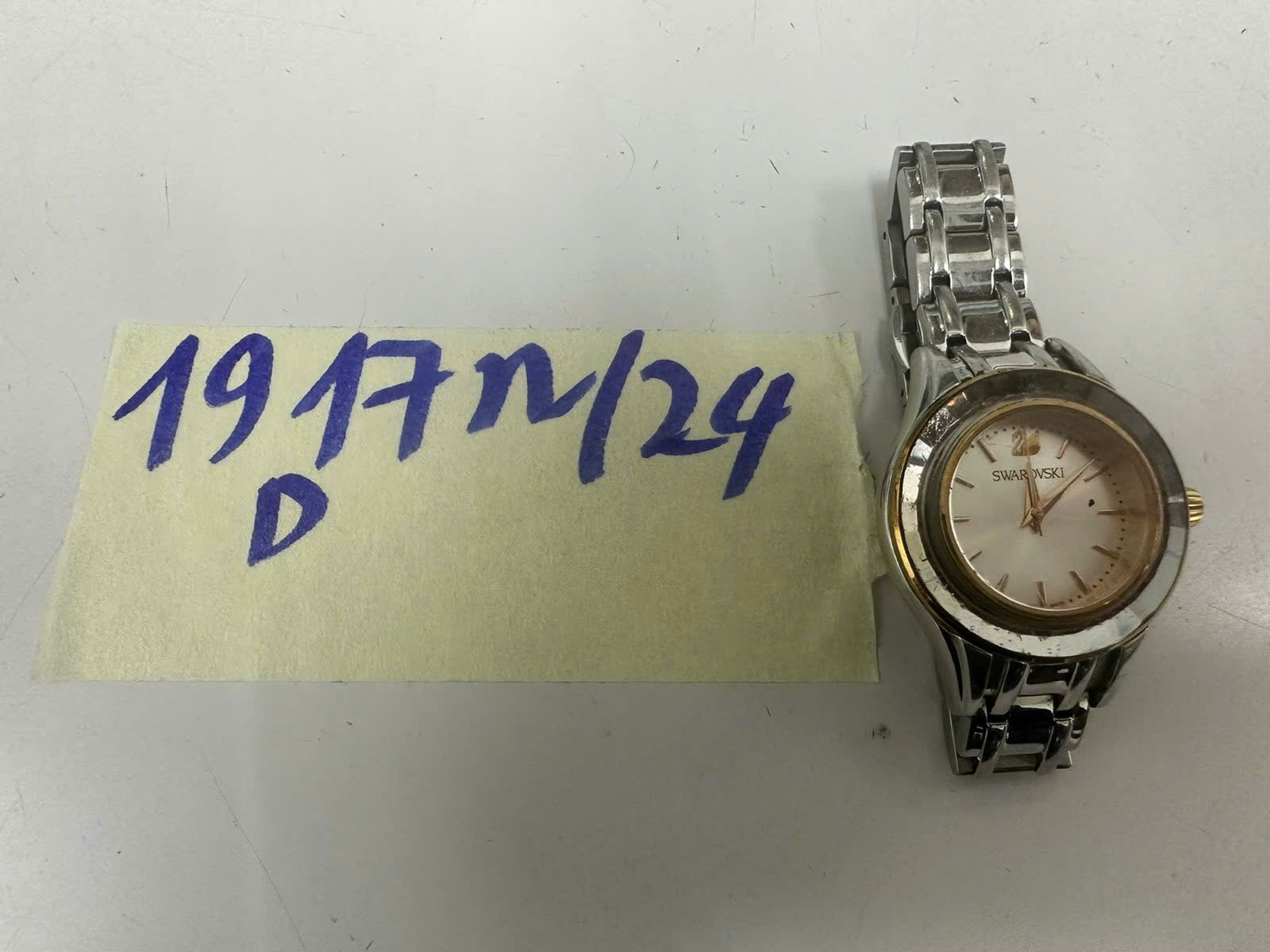 Ngày tiếp nhận: 08/11/2024 Mã hồ sơ: 1917N2024D Mô tả: 01 Đồng hồ dây kim loại màu trắng và mặt có chữ "Swarovski". |