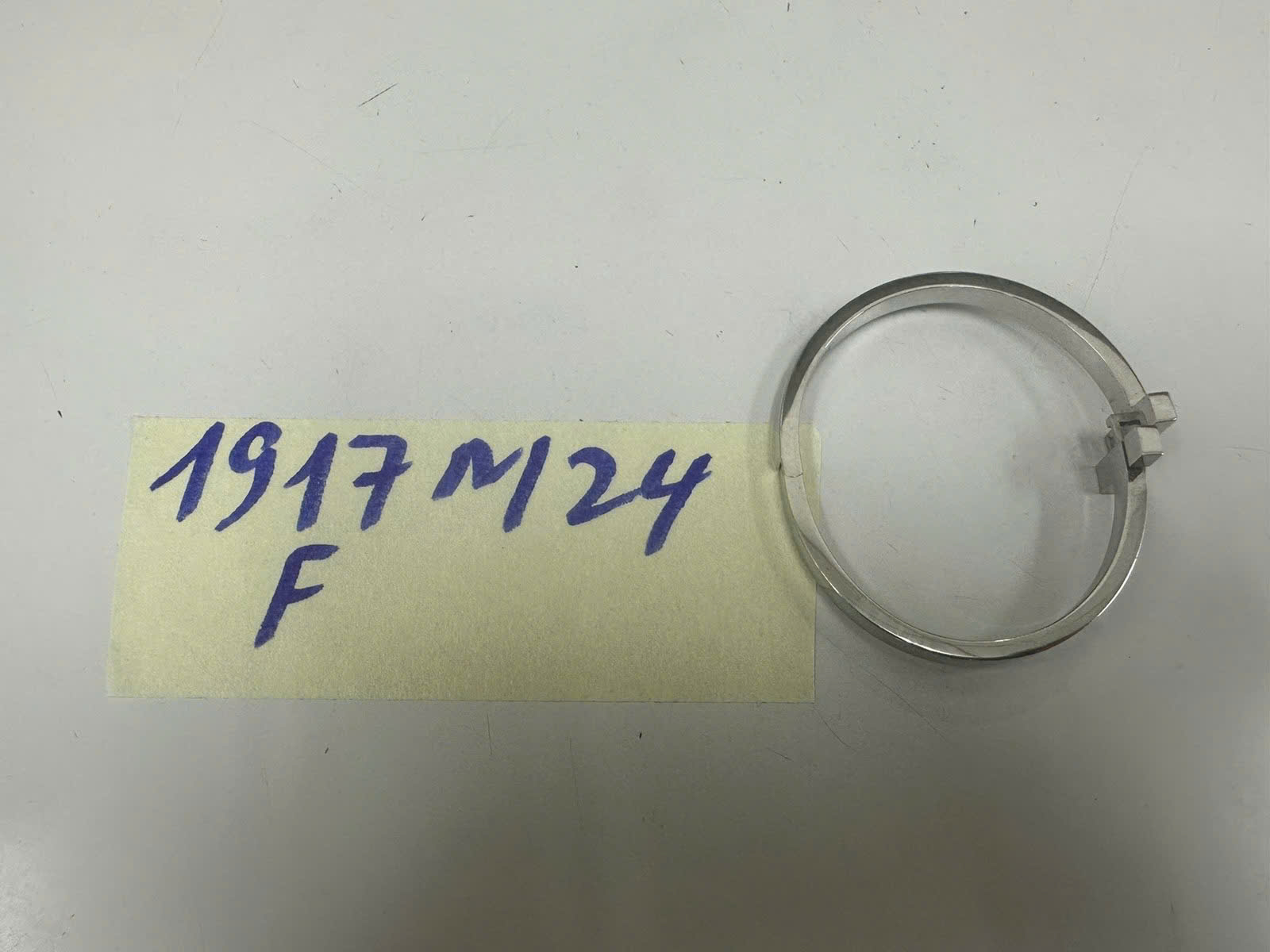 Ngày tiếp nhận: 08/11/2024 Mã hồ sơ: 1917N2024F Mô tả: 01 Vòng tay màu bạc, bên trong có ghi "Kai&Leo2024", "Tiffany & Co, Au750 Italy". |