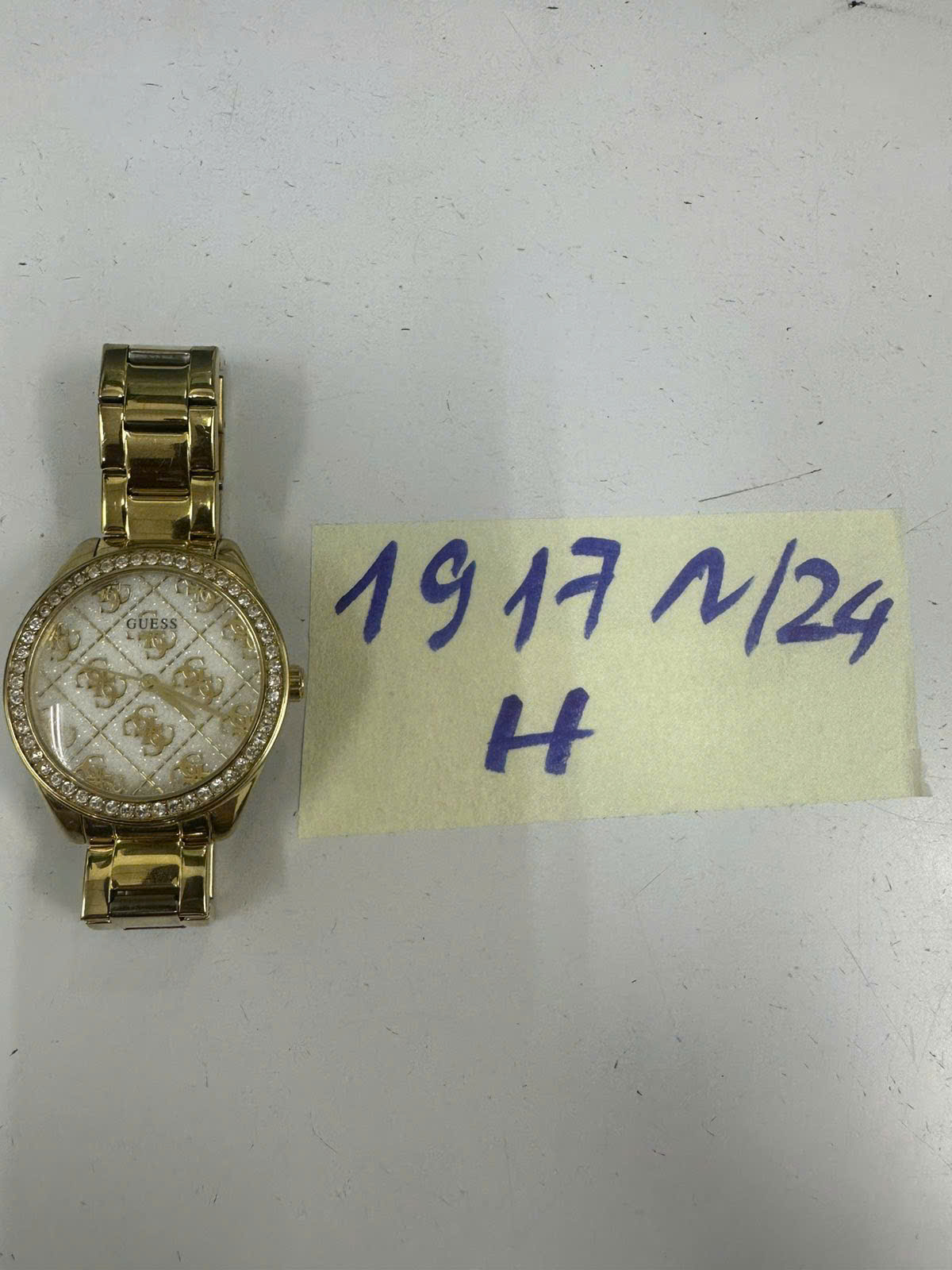 Ngày tiếp nhận: 08/11/2024 Mã hồ sơ: 1917N2024H Mô tả: 01 Đồng hồ kim loại màu vàng, mặt trắng ô vuông có chữ "GUESS". |