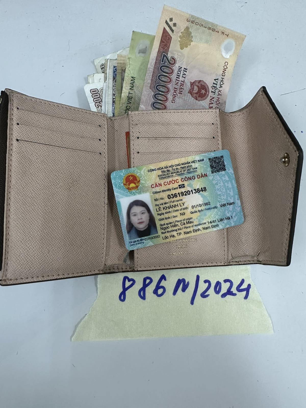 Ngày tiếp nhận: 08/6/2024 Mã hồ sơ: 886N2024 Mô tả: 01 Ví màu nâu bên trong có 01 CCCD tên LÊ KHÁNH LY, 01 thẻ ngân hàng Liên Việt số tiền 340,000 vnđ. |