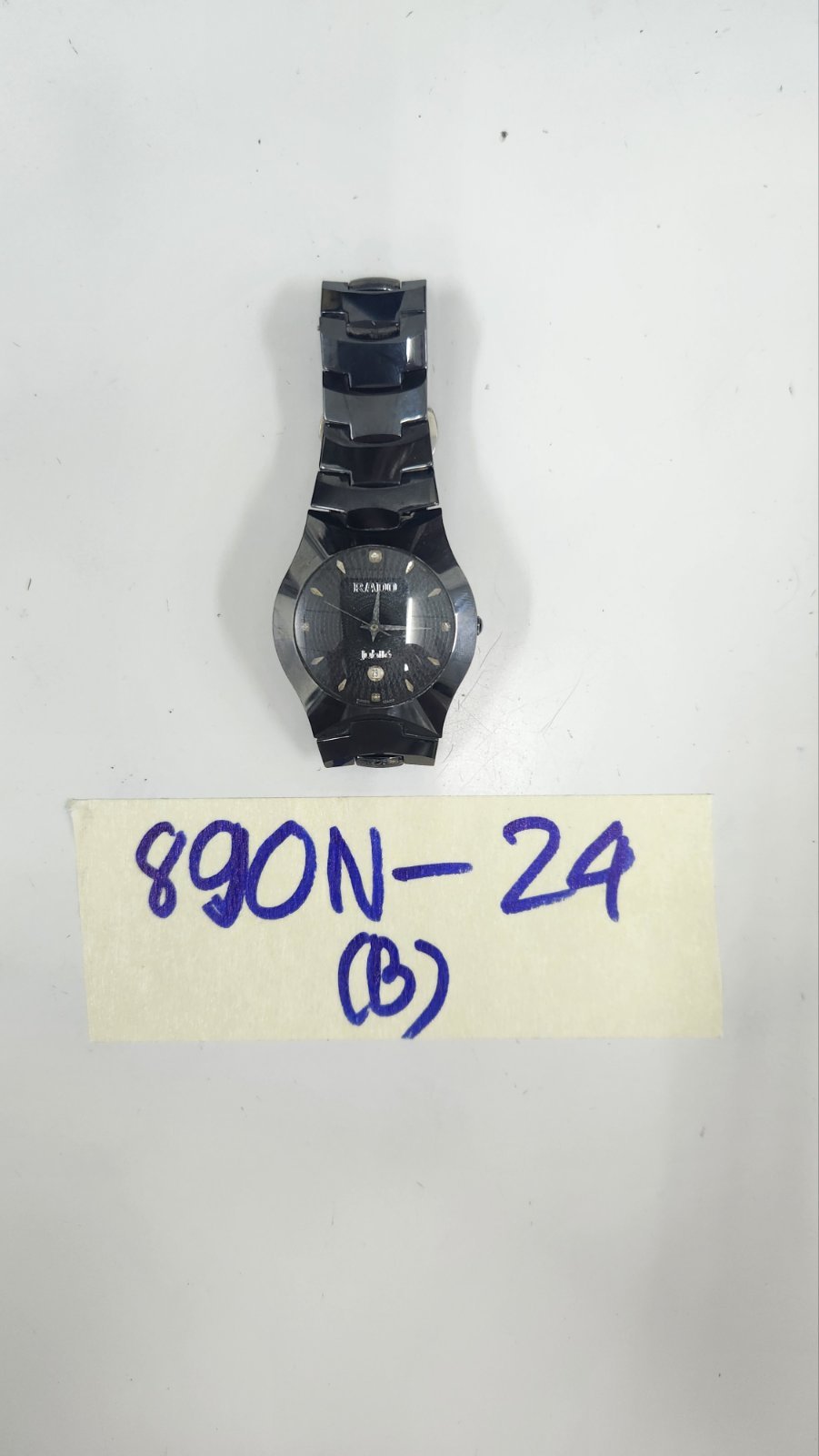 Ngày tiếp nhận: 08/6/2024 Mã hồ sơ: 890N2024B Mô tả: 01 đồng hồ mặt tròn màu đen có chữ RADO, dây đeo bằng kim loại màu đen. |