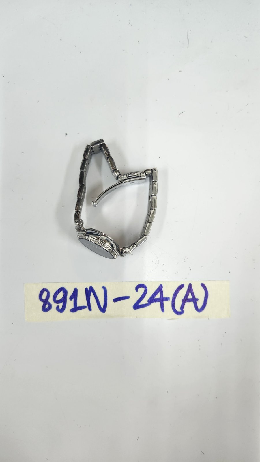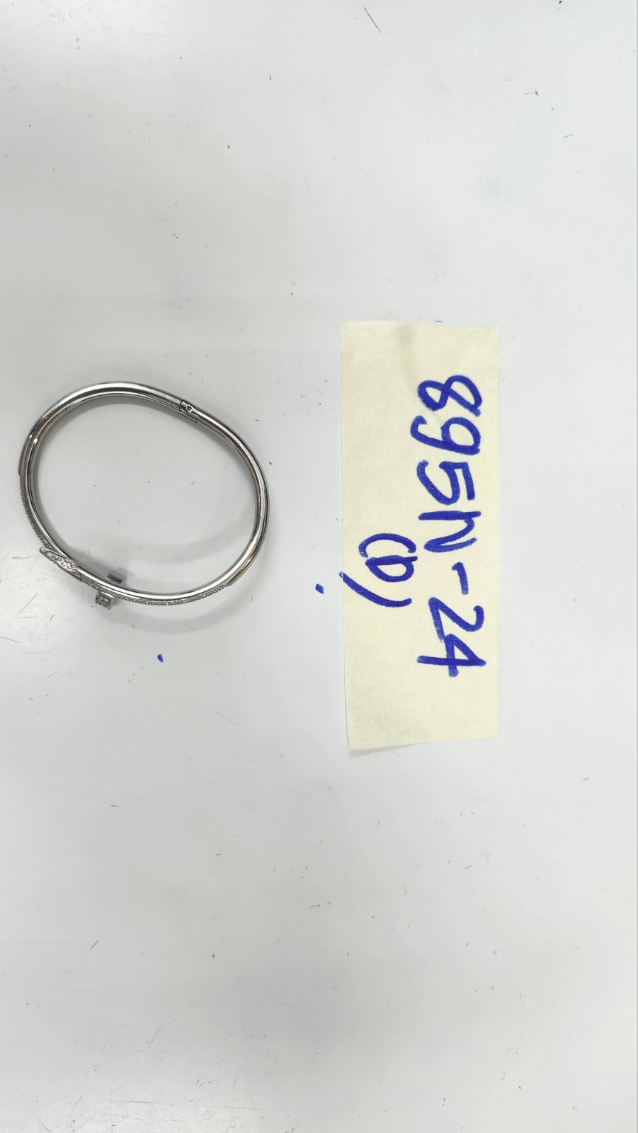 Ngày tiếp nhận: 08/6/2024 Mã hồ sơ: 895N2024D Mô tả: 01 vòng tay bằng kim loại màu trắng có đính đá màu trắng, mặt trong vòng có khắc logo chữ CARTIER đã qua sử dụng. |