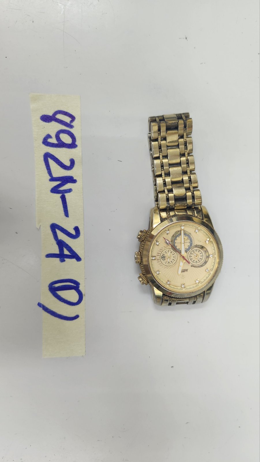 Ngày tiếp nhận: 08/6/2024 Mã hồ sơ: 892N2024D Mô tả: 01 đồng hồ có chữ AOII mặt màu vàng, dây đeo bằng kim loại màu vàng. |