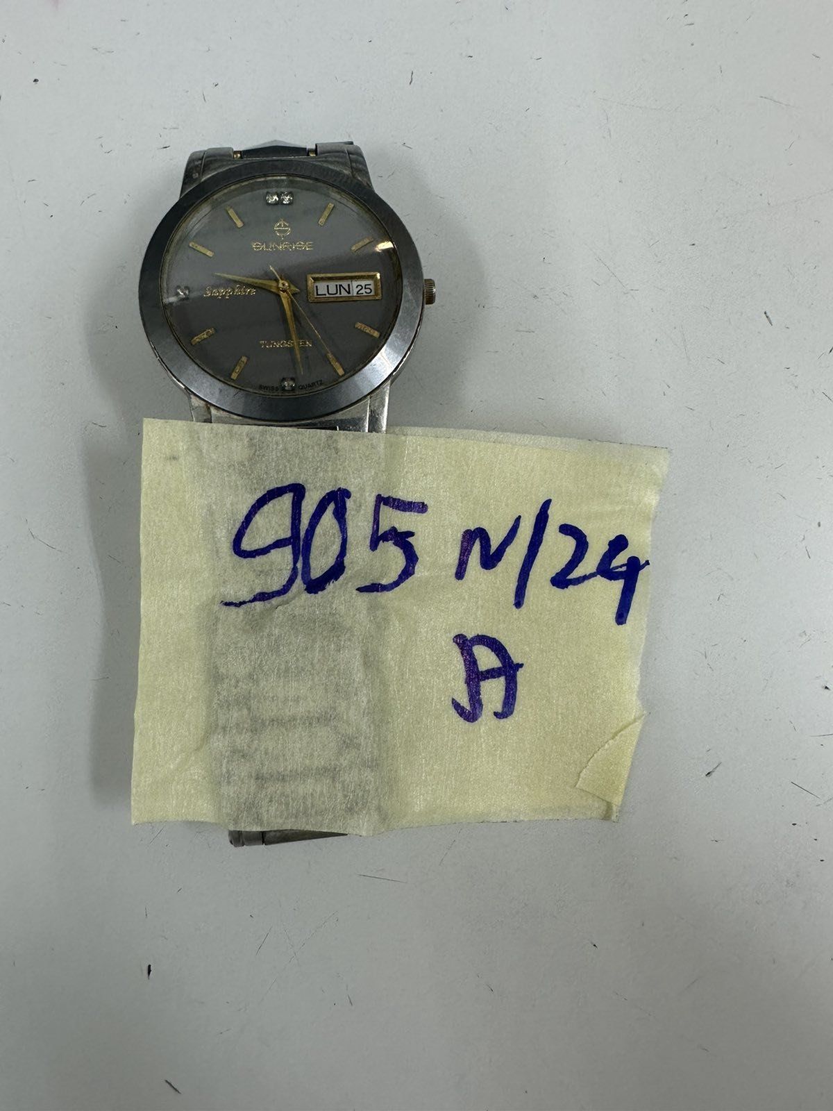 Ngày tiếp nhận: 10/6/2024 Mã hồ sơ: 905N2024A Mô tả: 01 đồng hồ dây kim loại màu bạc, mặt tròn bên trong có chữ "SUNRISE". |