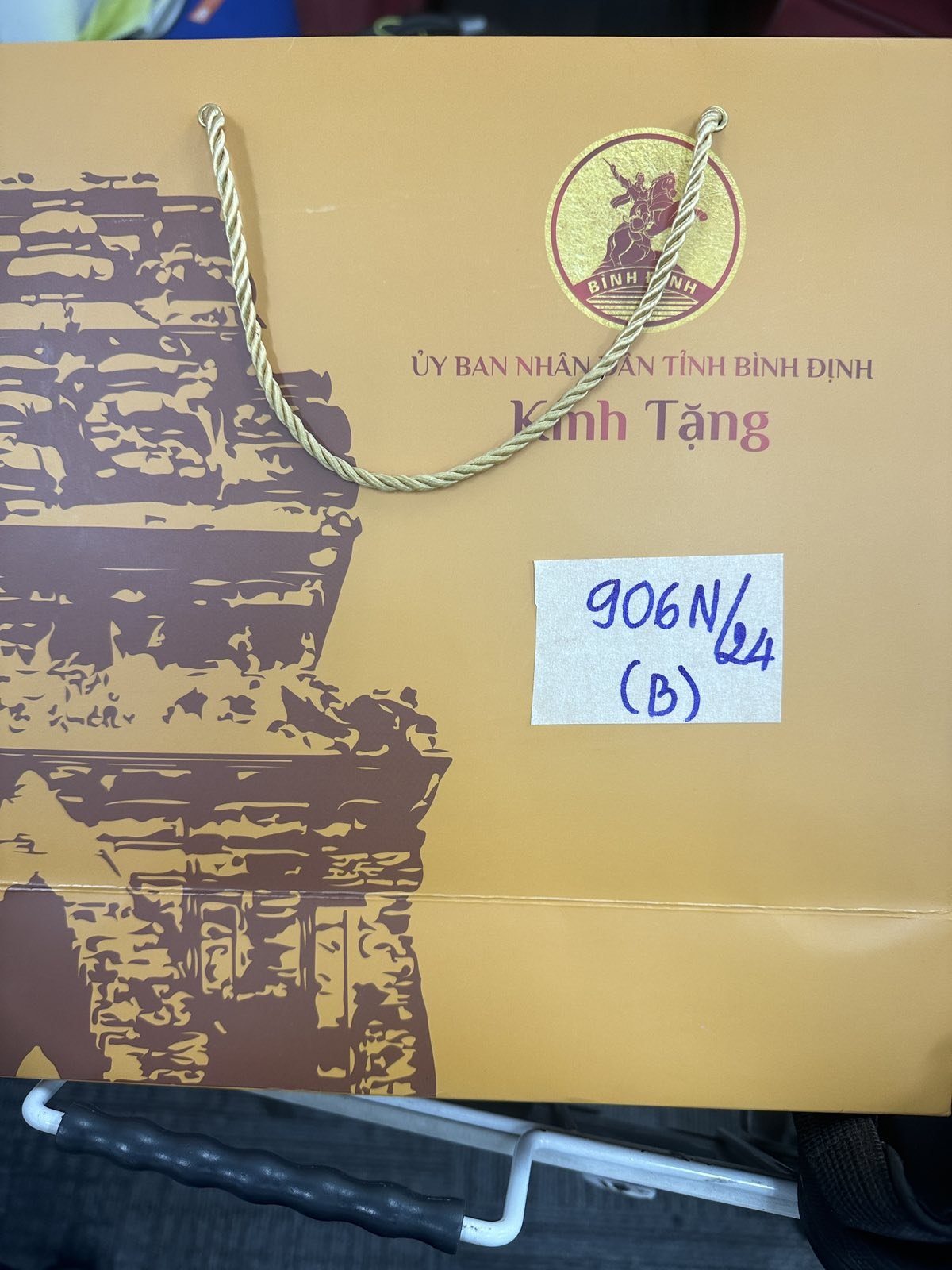 Ngày tiếp nhận: 11/6/2024 Mã hồ sơ: 906N2024B Mô tả: 01 hộp giấy màu vàng chứa 01 kỷ niệm chương màu vàng và thực phẩm. |