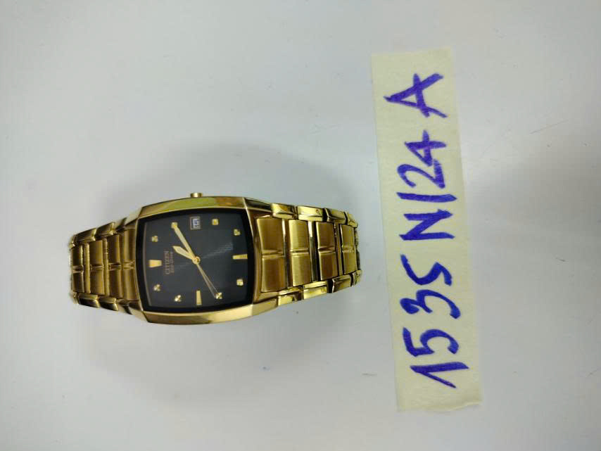Ngày tiếp nhận: 11/9/2024 Mã hồ sơ: 1535N2024A Mô tả: 01 đồng hồ mặt màu đen viền vàng có chữ Citizen dây đeo kim loại màu vàng. |