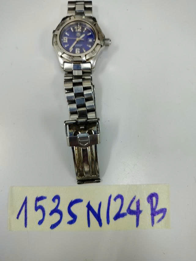 Ngày tiếp nhận: 11/9/2024 Mã hồ sơ: 1535N2024B Mô tả: 01 đồng hồ mặt màu xanh dương viền trắng có chữ Tag Heuer, dây đeo kim loại màu trắng. |