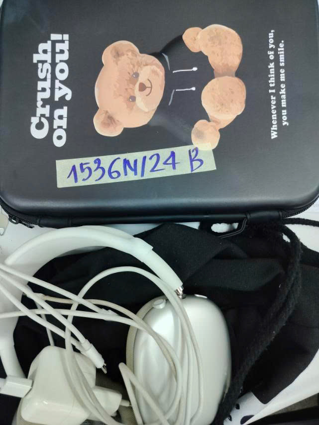 Ngày tiếp nhận: 11/9/2024 Mã hồ sơ: 1536N2024B Mô tả: 01 túi xách màu đen có hình con chó bên trong có 01 case màu đen có hình con gấu có chữ Crush on you bên trong có 01 ipad màu xám, 01 tai nghe AirPro/ Apple màu trắng/xám, ipad ở trông case màu đen cao su và nhiều boarding pass có tên Kim Jisuk (Air Asia và tway), 02 sạc pin Apple. |