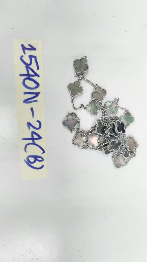 Ngày tiếp nhận: 11/9/2024 Mã hồ sơ: 1540N2024B Mô tả: 01 dây chuyền màu bạc trên dây chuyền có nhiều mặt hình cỏ bốn lá. |