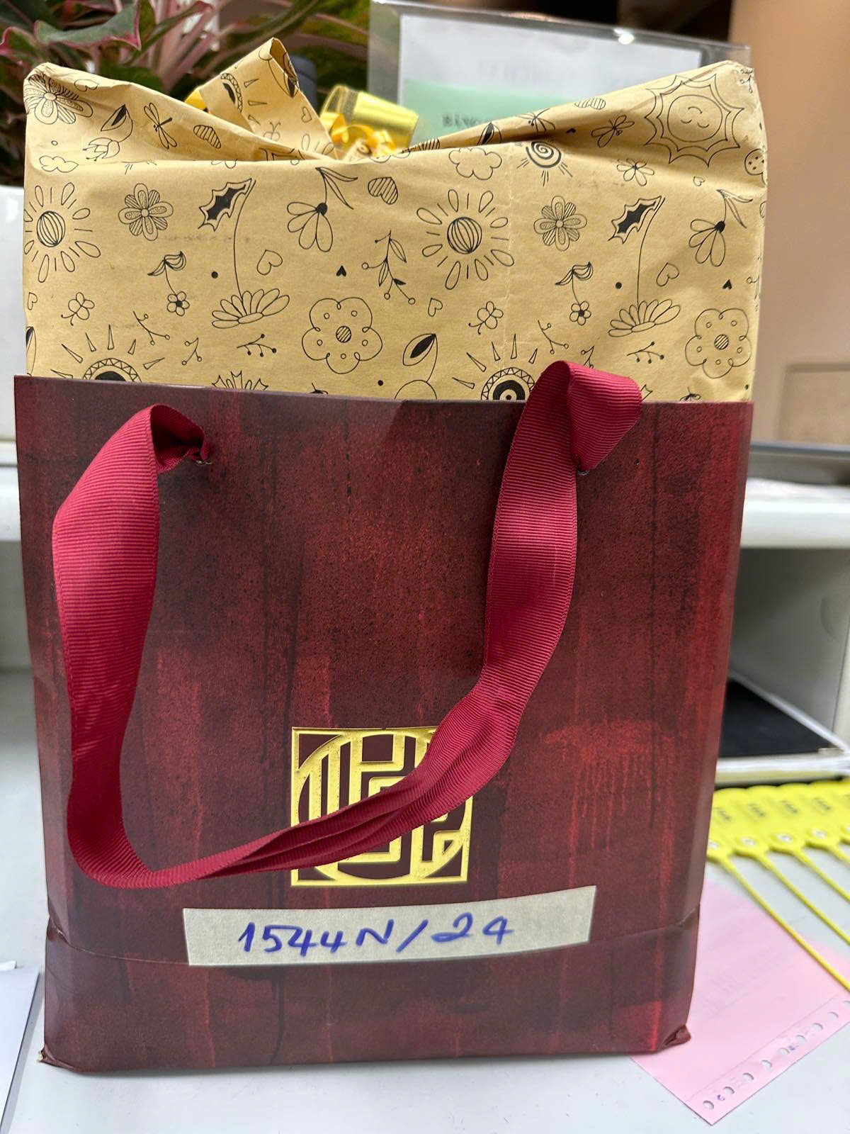 Ngày tiếp nhận: 12/9/2024 Mã hồ sơ: 1544N2024 Mô tả: 01 túi giấy màu đỏ đã qua sử dụng có 01 thanh gỗ màu đen nhiều nhánh qua sử dụng, 02 viên đá màu tím dạng lưu niệm, 01 vòng đeo tay bằng nhựa màu đen có khoen kim loại màu vàng + 01 hình Phật đã qua sử dụng, 01 hộp white chocolate, quần áo màu đen. |