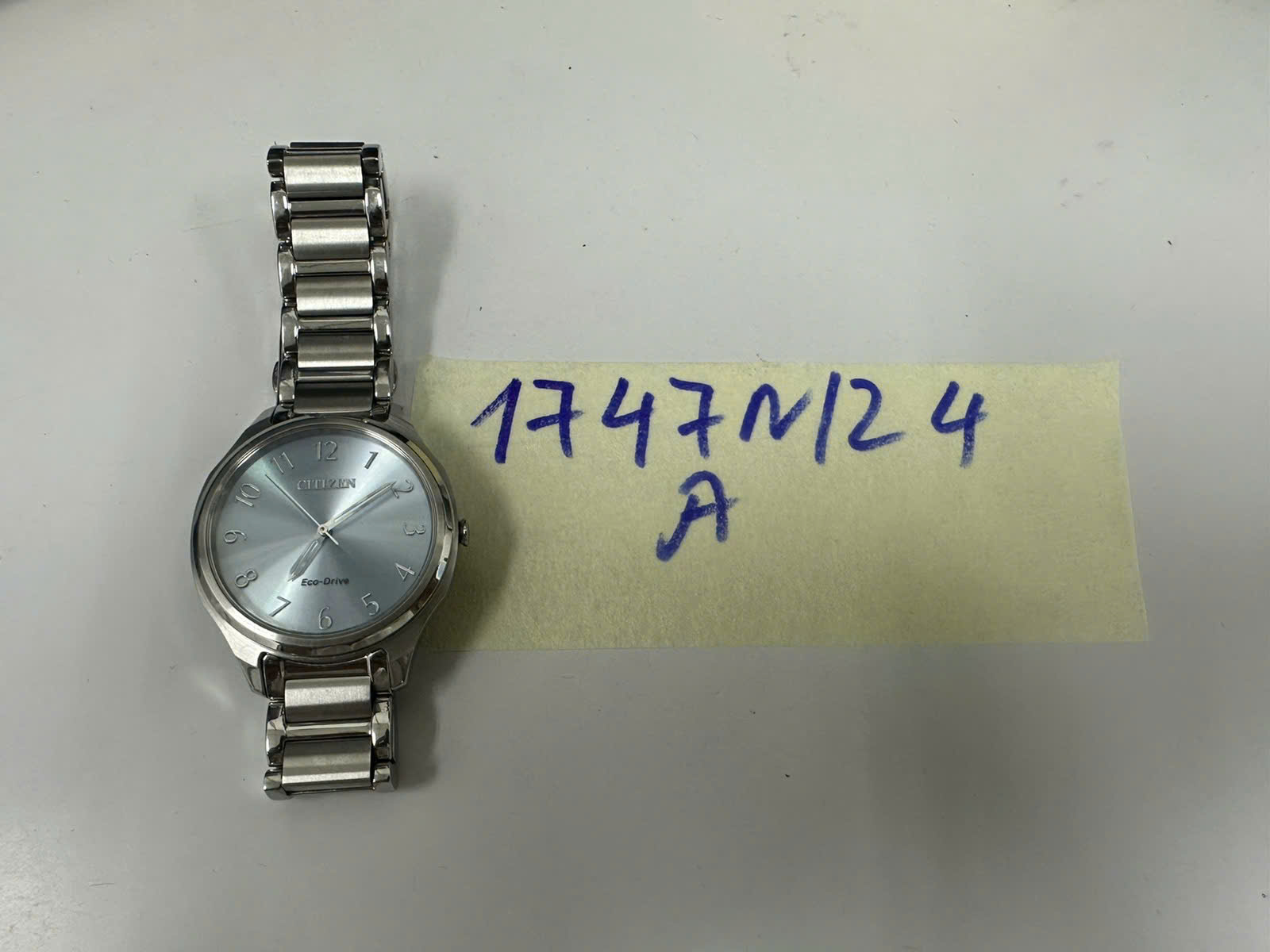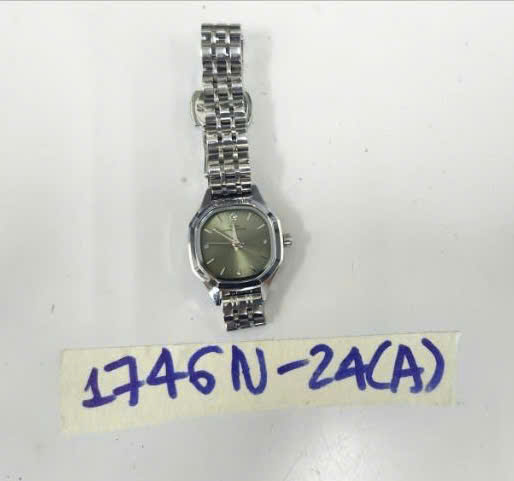 Ngày tiếp nhận: 13/10/2024 Mã hồ sơ: 1747N2024A Mô tả: 01 (một) đồng hồ kim loại màu bạc, mặt đồng hồ hình tròn màu xanh có chữ "CITIZEN", dây kim loại màu bạc. |