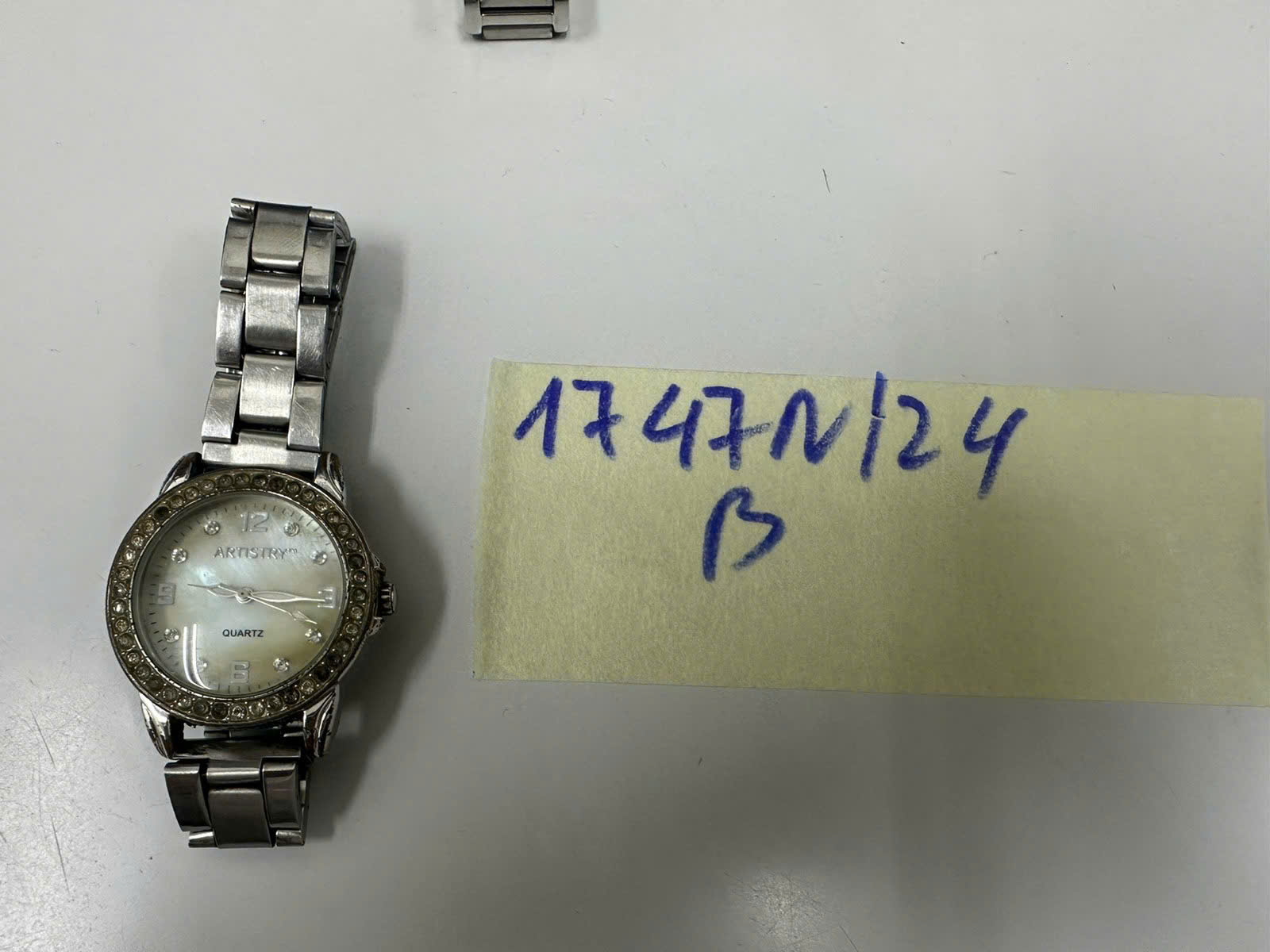 Ngày tiếp nhận: 13/10/2024 Mã hồ sơ: 1747N2024B Mô tả: 01 (một) đồng hồ kim loại màu bạc, mặt đồng hồ hình tròn màu vàng có chữ "ARTISTRY", viền đồng hồ đính đá, dây kim loại màu bạc. |
