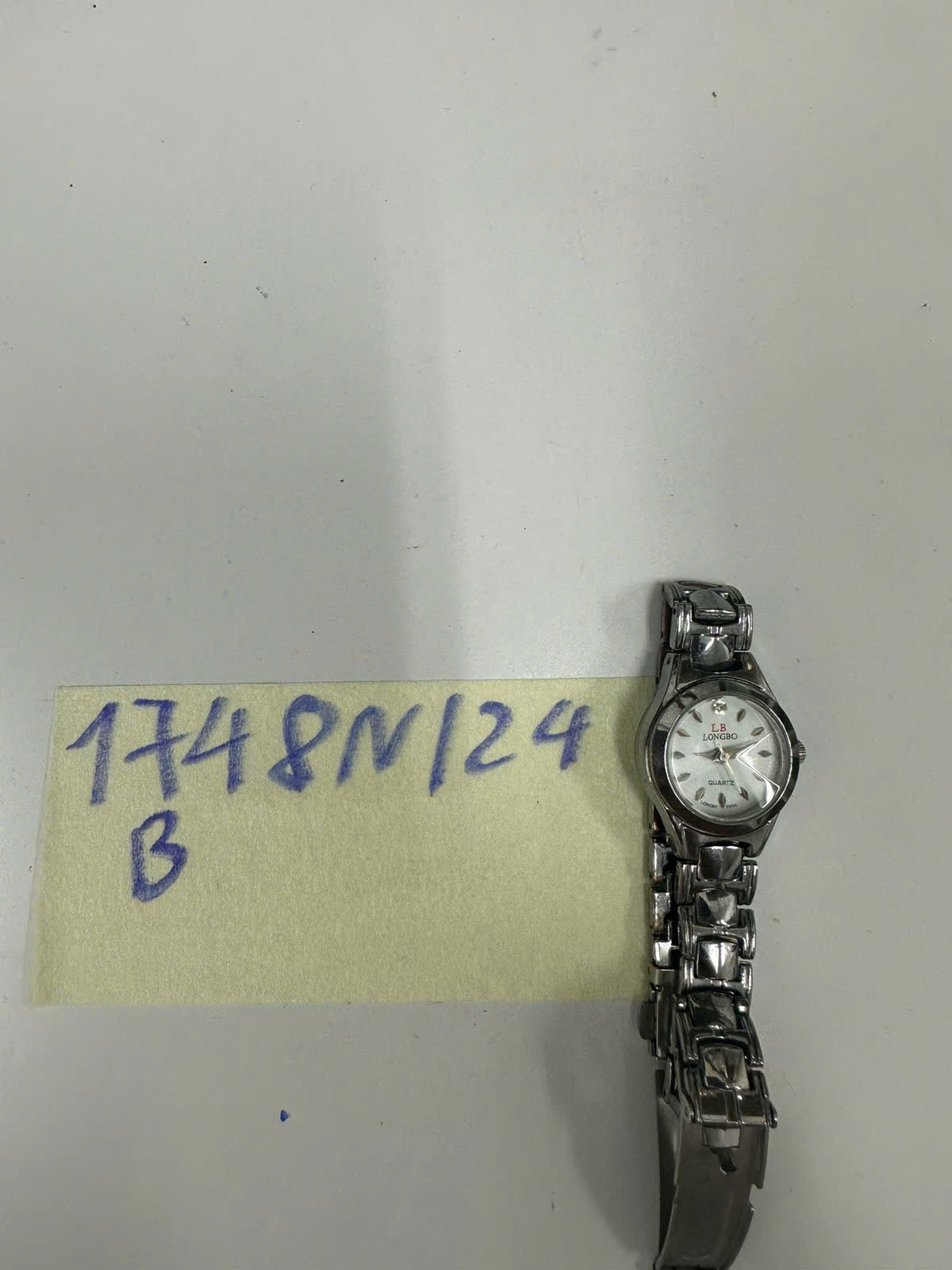 Ngày tiếp nhận: 13/10/2024 Mã hồ sơ: 1748N2024B Mô tả: 01 đồng hồ đeo tay bằng kim loại bạc, mặt hình tròn có chữ LB LONGB0. |